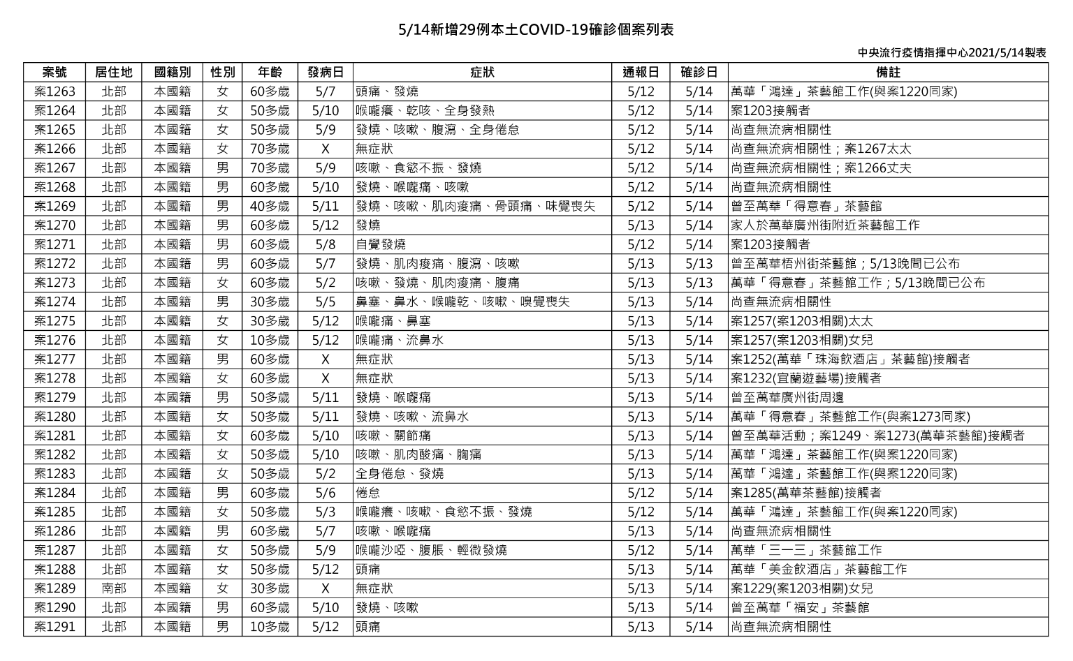 中央流行疫情指揮中心今(14)日公布國內新增29例本土COVID-19確定病例(案1263至案1291),皆為本國籍,指揮中心今日也證實,其中案1272、案1273正是昨日傳出和平醫院的2名確診者。這29例本土病例中,有7例感染源不明,其中年紀最小的僅十多歲。
