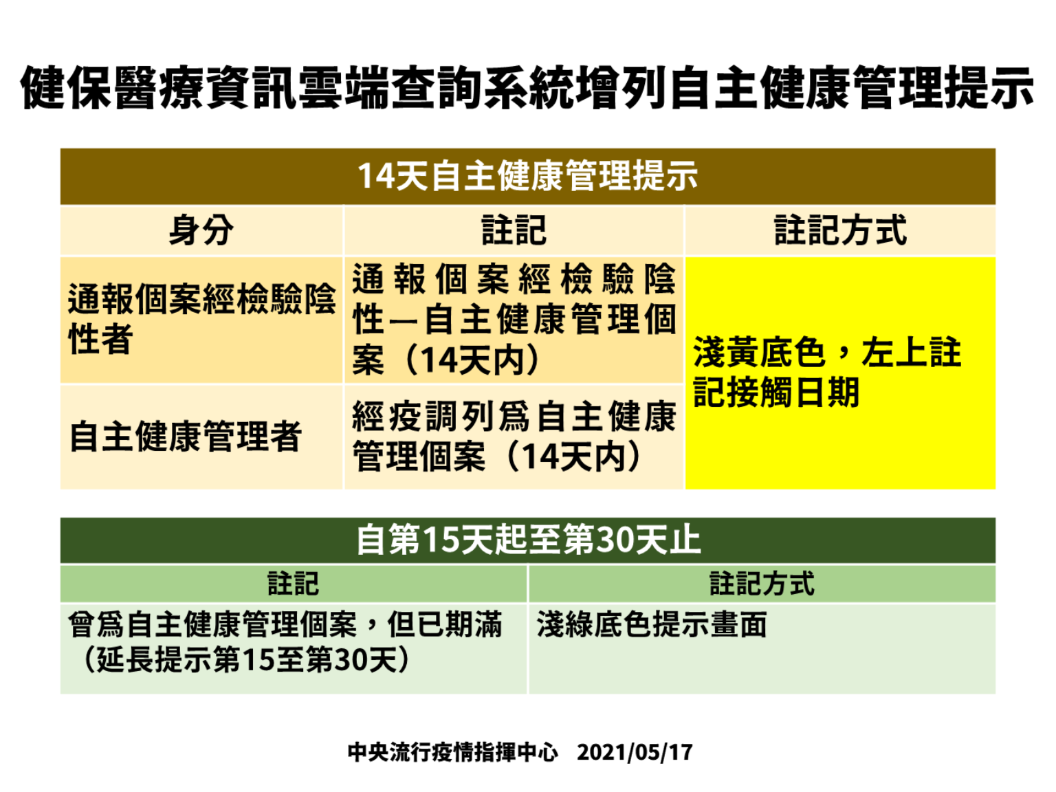 指揮中心今日表示,因應國內本土COVID-19疫情,中央健康保險署自即日起,陸續將通報個案經檢驗陰性者及經疫調列為自主健康管理者,分別於健保醫療資訊雲端查詢系統註記為「通報個案經檢驗陰性—自主健康管理個案(14天内)」、「經疫調列為自主健康管理個案(14天内)」。