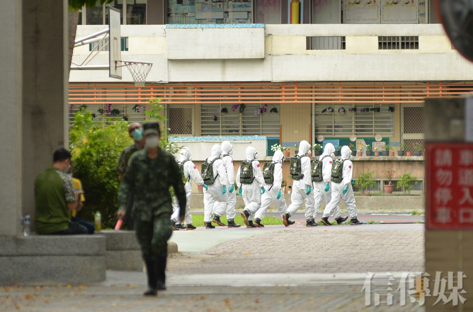 17日化學兵就曾在龍山國小消毒,18日再見化學兵群多輛軍車駛入,進行全校大消毒。捷運龍山寺站的一號出口平時人潮多到延伸到西園路、和平西路的車輛動線,如今門可羅雀,空無一人。