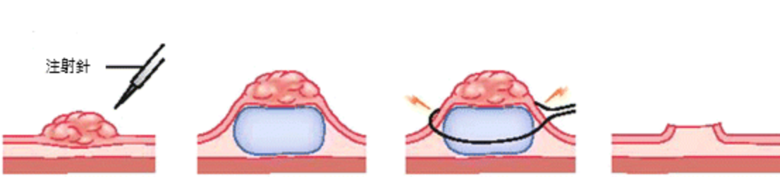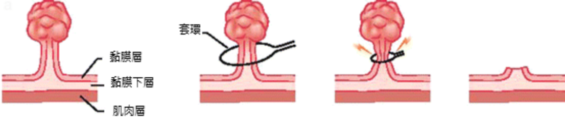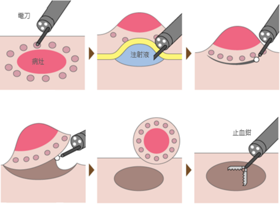 對於較小的息肉,可用切片夾,直接把息肉夾掉;而較大的息肉(0.5公分以上),則會用金屬套環直接切除(圖一),但是平坦型且體型較大的息肉就必須用內視鏡黏膜切除術 (Endoscopic Mucosal Resection, EMR):先使用注射針使病灶隆起後再切除(圖二)。如果遇到的息肉更大(通常大於2公分以上),就必須要安排住院安排內視鏡黏膜剝下離術(Endoscopic Submucosal Dissection, ESD):先使用注射針把病灶隆起後,再用電刀把病灶一點一點地「鏟」起來(圖三)。