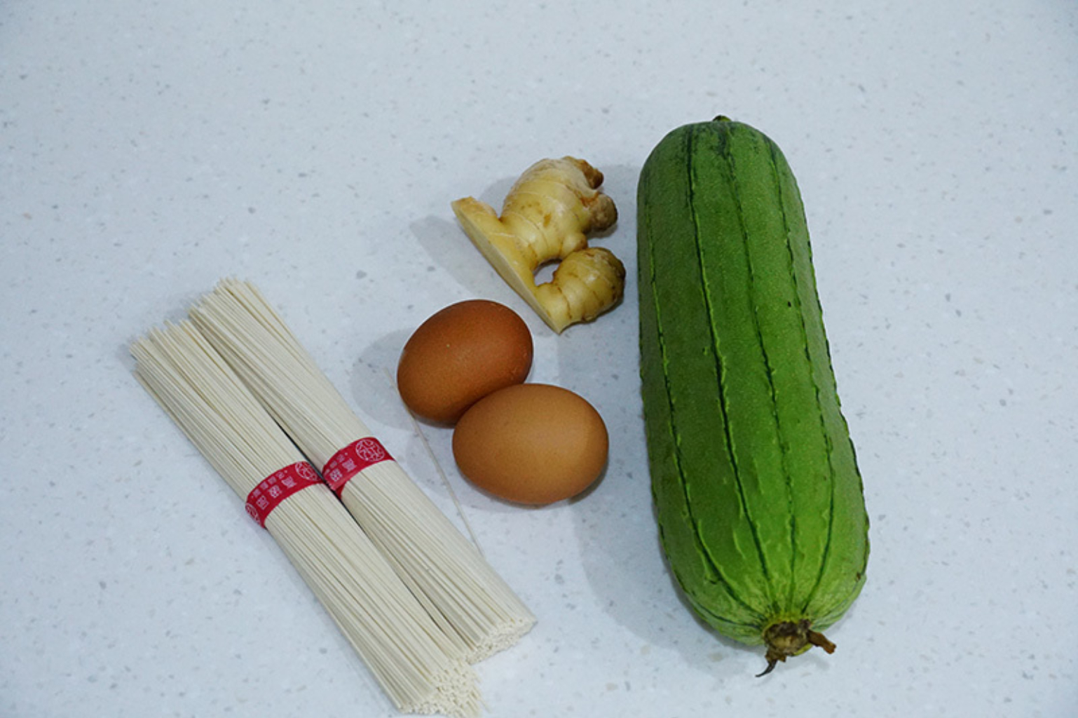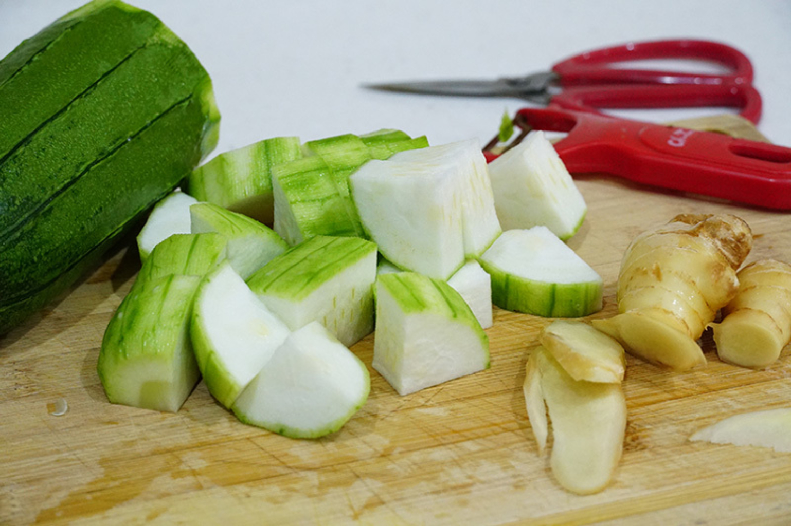 這次家常絲瓜麵線的備料相當簡單。一開始切薑片,絲瓜只許要使用半條,削皮後切塊。
