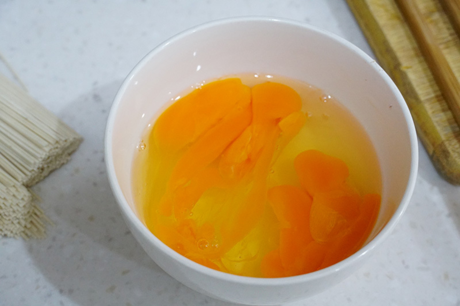 雞蛋兩顆先打入碗中,將蛋黃戳破即可,不需要打勻。
