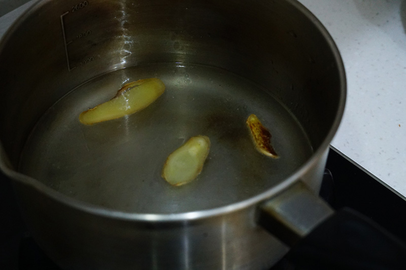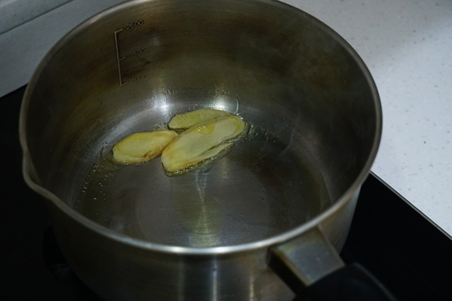 取一個小湯鍋,加入橄欖油或是苦茶油熱鍋,放入薑片爆香。