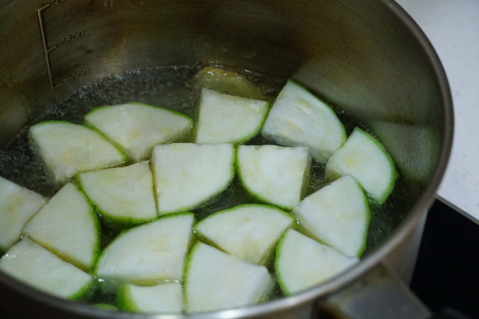爆香後加入清水約500c.c.。將水重新煮滾後,加入絲瓜。