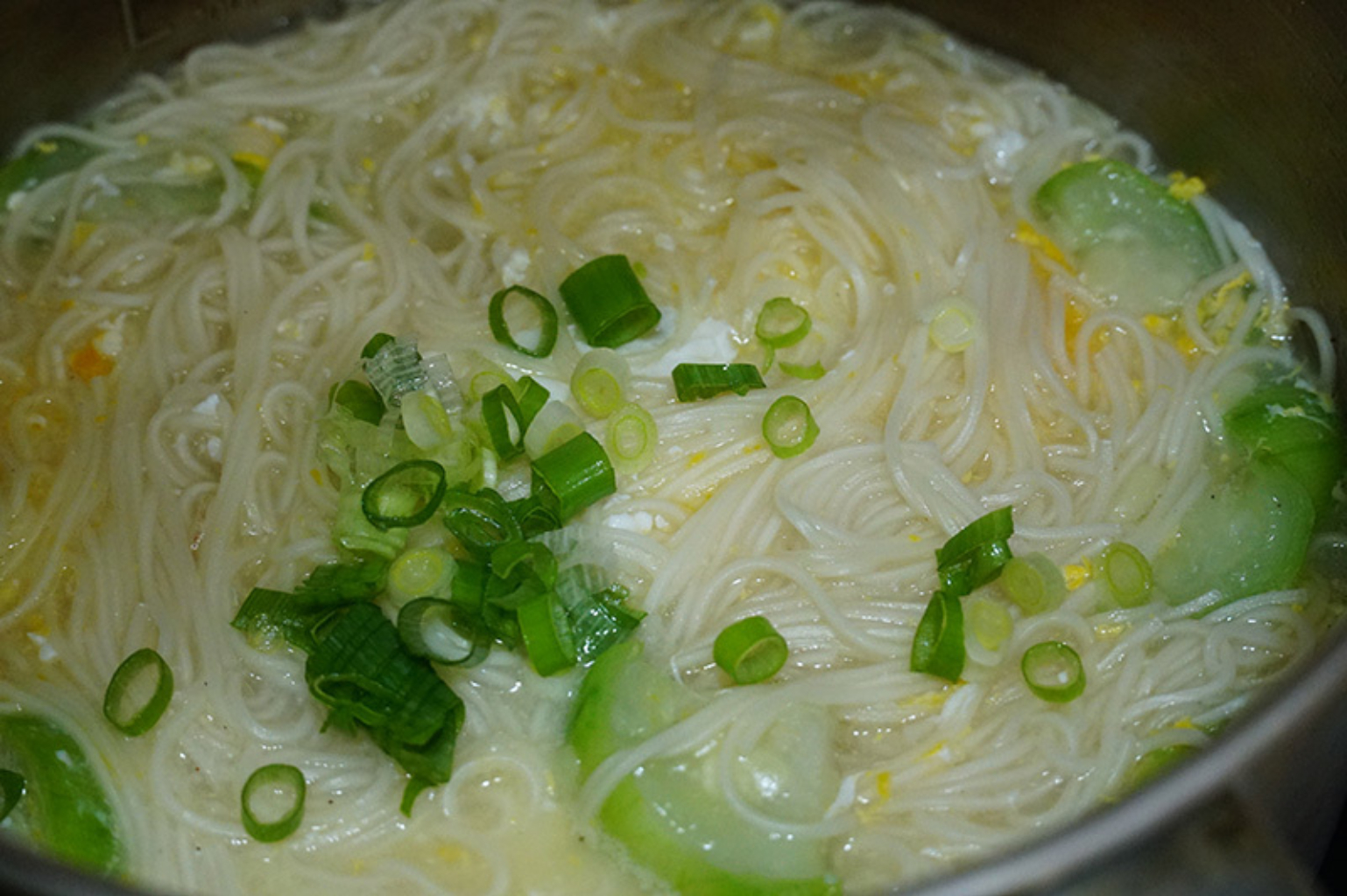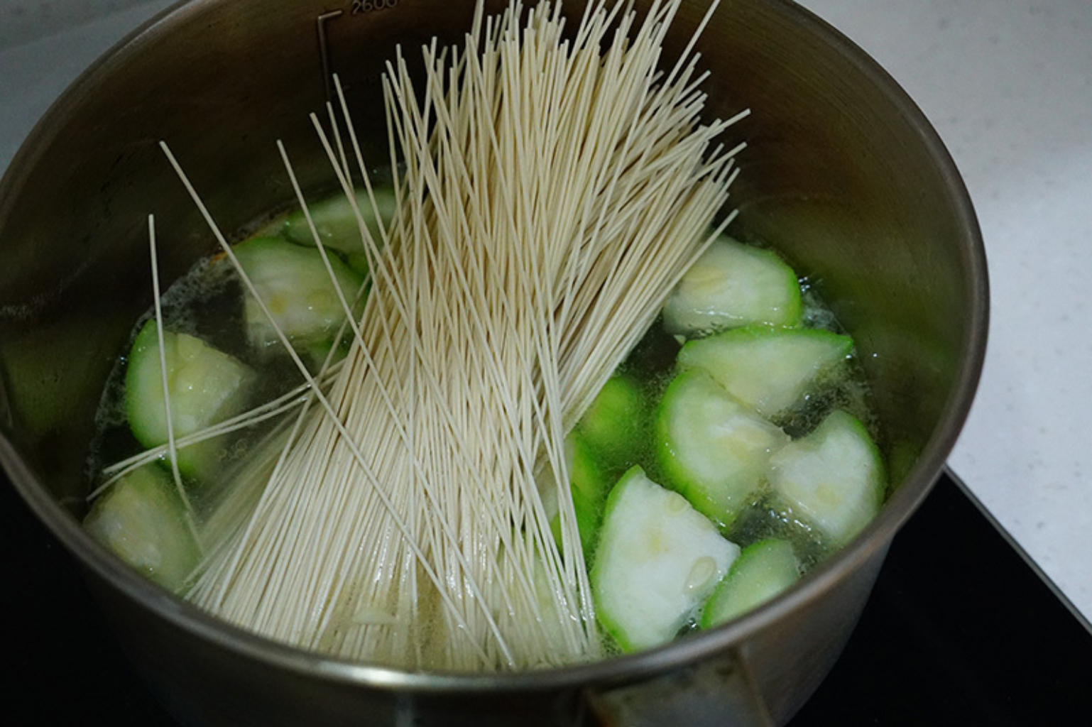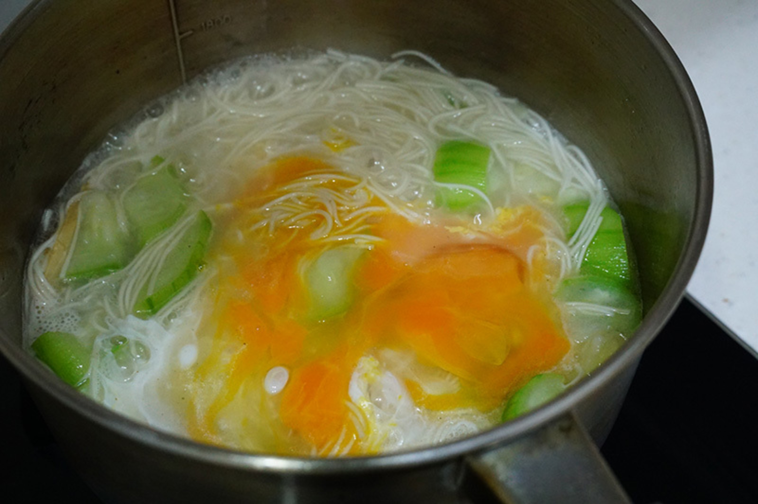 絲瓜煮軟後即可加入麵線。一般來說麵線大約2~3分鐘就熟透了,不需要煮太久。