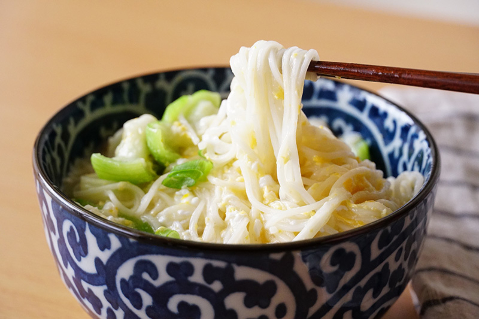 麵煮熟後,加入鹽巴約2小匙與白胡椒粉調味。調味攪拌後,加入雞蛋。稍加攪拌(不要太均勻維持雞蛋完整口感比較好),小火煮約30秒即可關火。