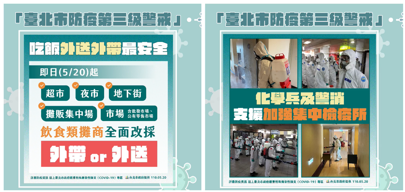 柯文哲宣布兩大新措施,20日起超市、夜市、地下街、攤販集中場、批發市場、公有零售市場的飲食類攤商「全面採取外帶、外送」。