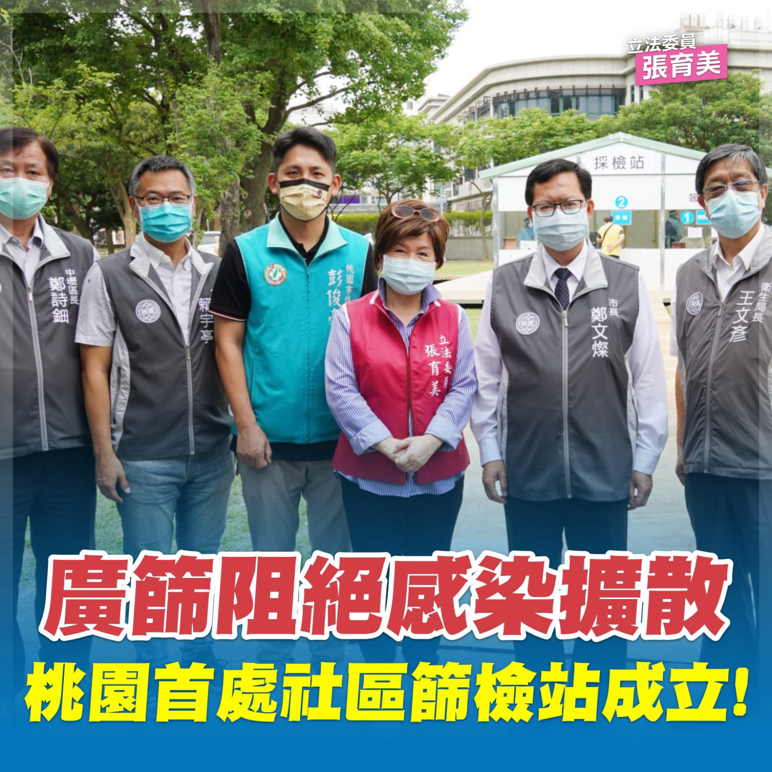 全桃園第一家社區篩檢站位於中壢區中正公園,由張育美的天晟醫院專業醫療團隊進駐。昨天啟用時,鄭文燦、張育美以及市議員彭俊豪等人一起合影, 鄭文燦還讓張育美站在正中間主位,彼此互動相當融洽。