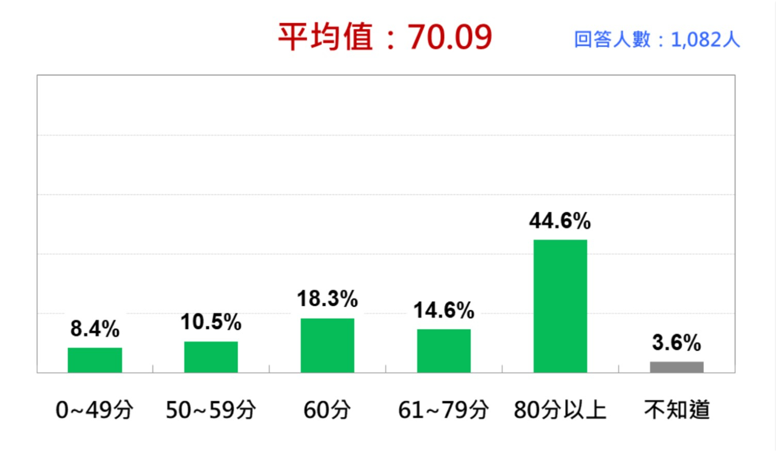 結果發現:22.4%的人打90 分以上,22.2%的人打80-89 分,14.5%的人打61-79分,18.3%的人打60 分,18.9%的人打60 分以下,3.6%不知道/拒答。