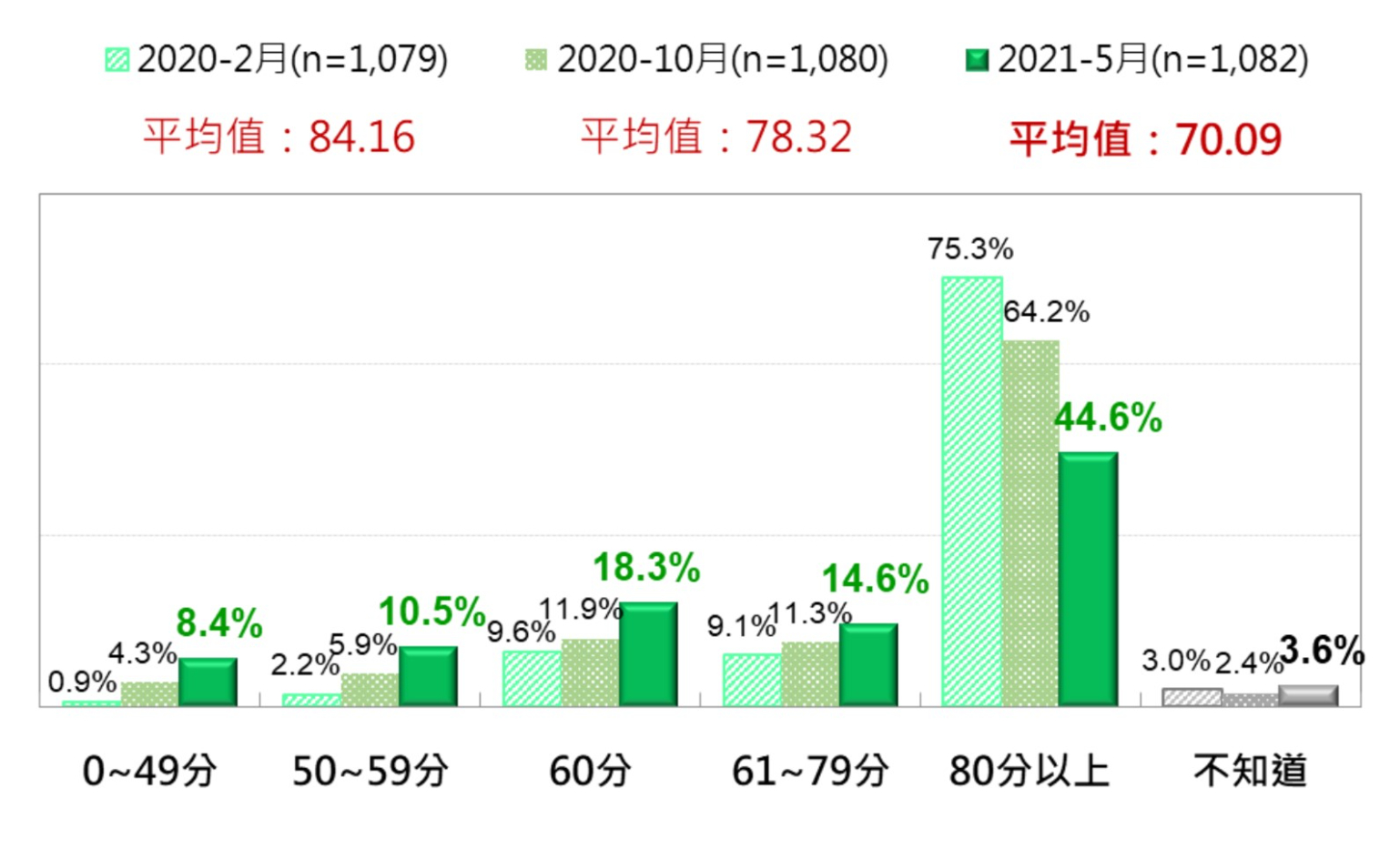 如果進一步與去年2月所做的同樣調查結果比較,可以發現,認為及格的比例減少16.6個百分點,打80分以上的比例減少30.7個百分點,整體平均分數也降低14.07分。