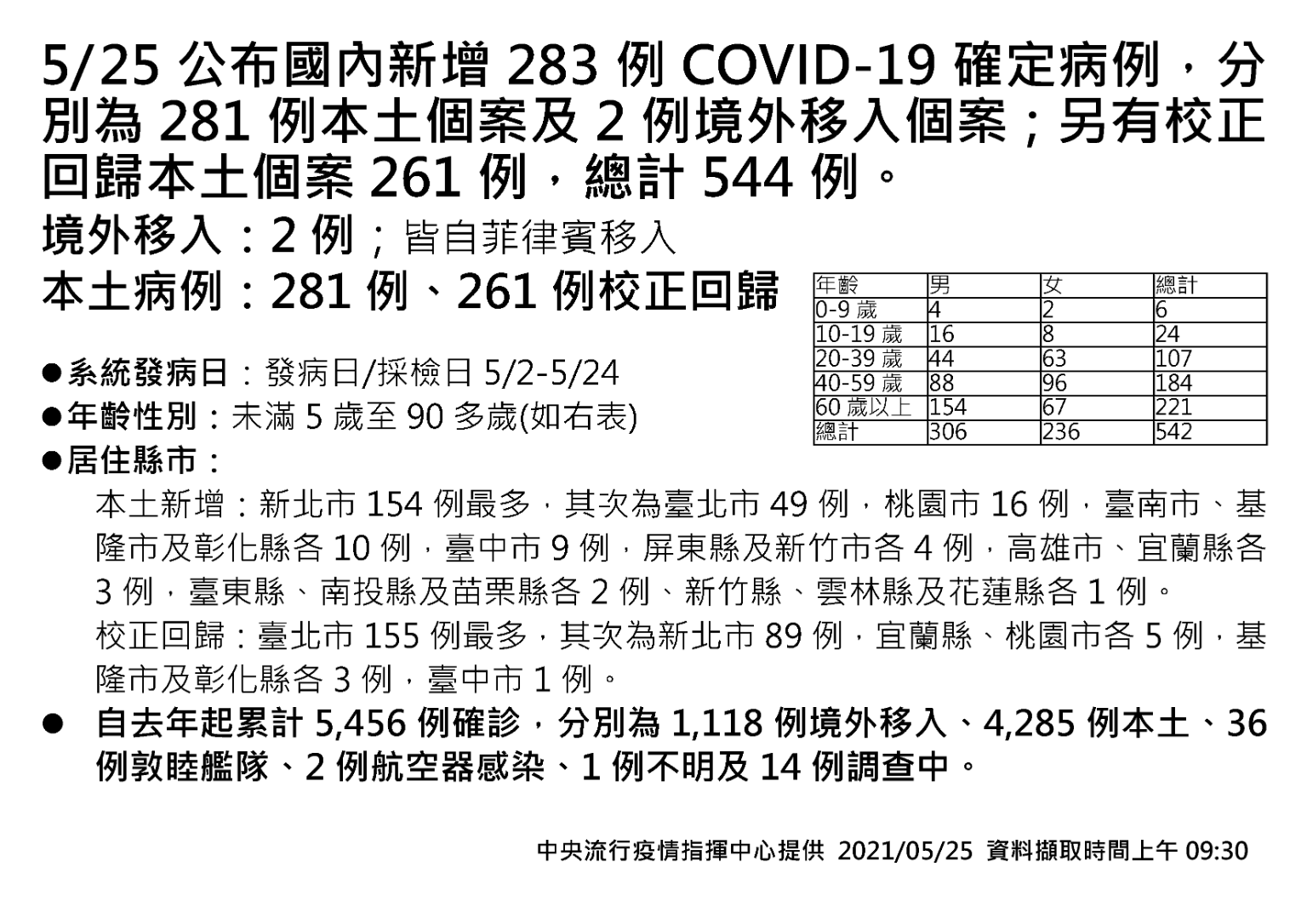 中央流行疫情指揮中心今(25)日公布國內新增283例COVID-19確定病例,分別為281例本土個案及2例境外移入個案;另有校正回歸本土個案261例,總計544例。確診個案中新增6例死亡。