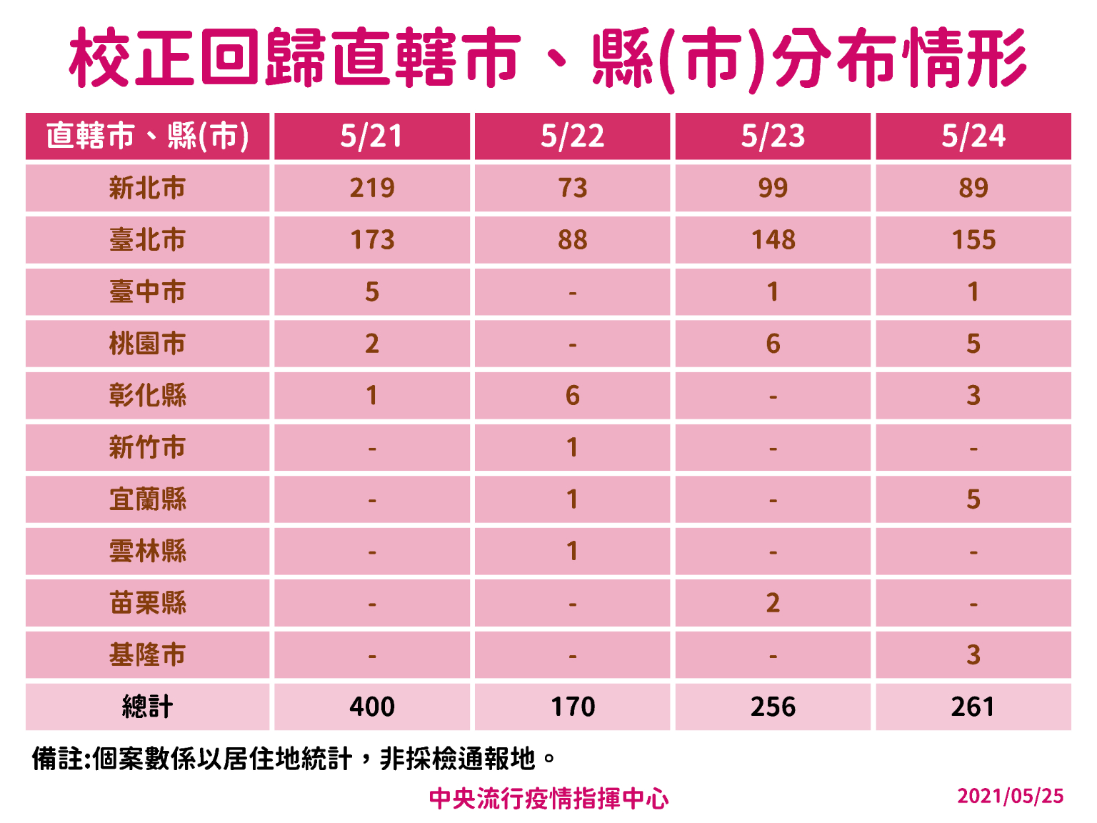 陳時中表示,今日新增之281例本土病例,為144例男性,137例女性,年齡介於未滿5歲至90多歲,發病日介於今年5月7日至5月24日;個案分布以新北市154例最多,其次為臺北市49例,桃園市16例,臺南市、基隆市及彰化縣各10例,臺中市9例,屏東縣及新竹市各4例,高雄市、宜蘭縣各3例,臺東縣、南投縣及苗栗縣各2例、新竹縣、雲林縣及花蓮縣各1例。