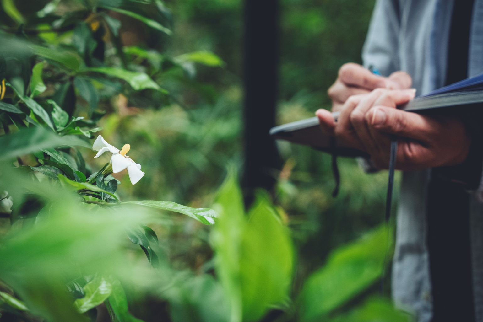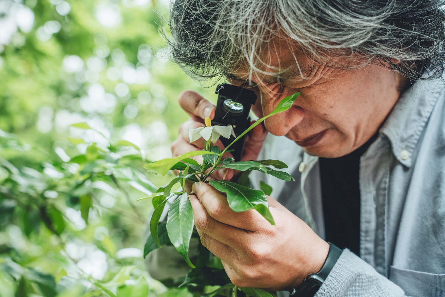 置身國立臺灣博物館-南門館的戶外園區,胡哲明立刻相中眼前一排山黃梔,滔滔不絕地說起梔子花的有趣之處。開滿一樹的花朵,有的潔白似雪,也有的金黃如錦緞,湊近一聞,更有陣陣醉人清香,他說民眾的觀看程度,大都僅止於此,但如果多看一眼雌蕊上的花粉,還能進一步學習到梔子花的花粉在花苞階段時就已沾黏在雌蕊表面上,是有別於一般植物的特點。「所以我透過學校、策展推廣『科學繪圖』,最主要是希望讓大家更仔細地觀察植物。」他笑道,「看久了通常會發現問題,從問題再回頭找資料,慢慢增加對植物的了解。」