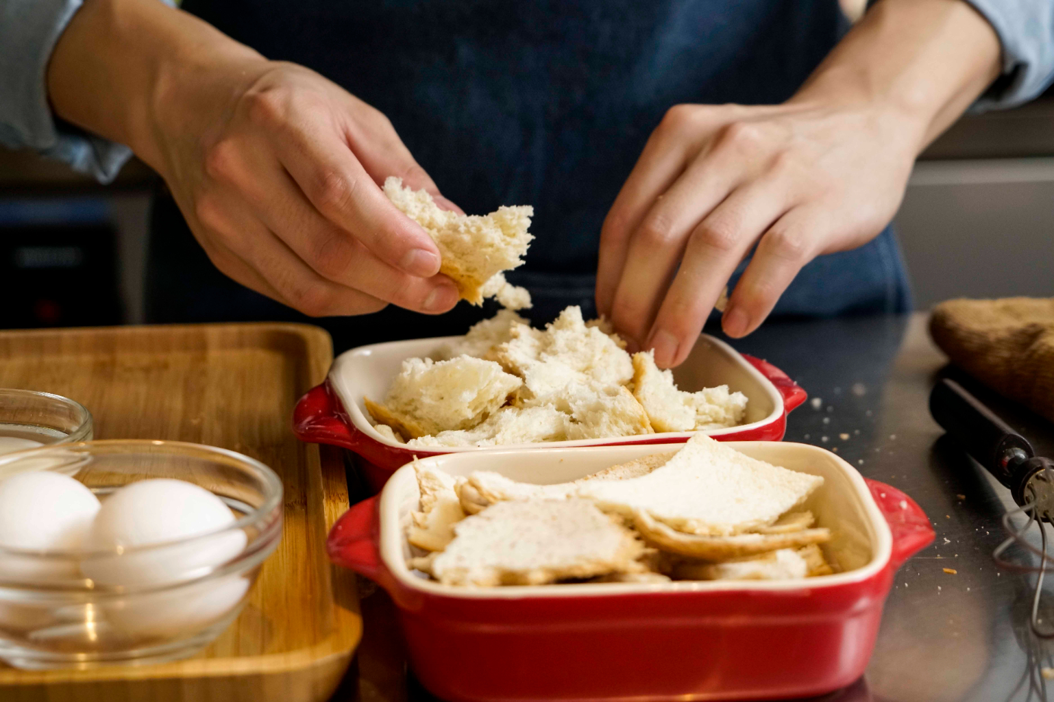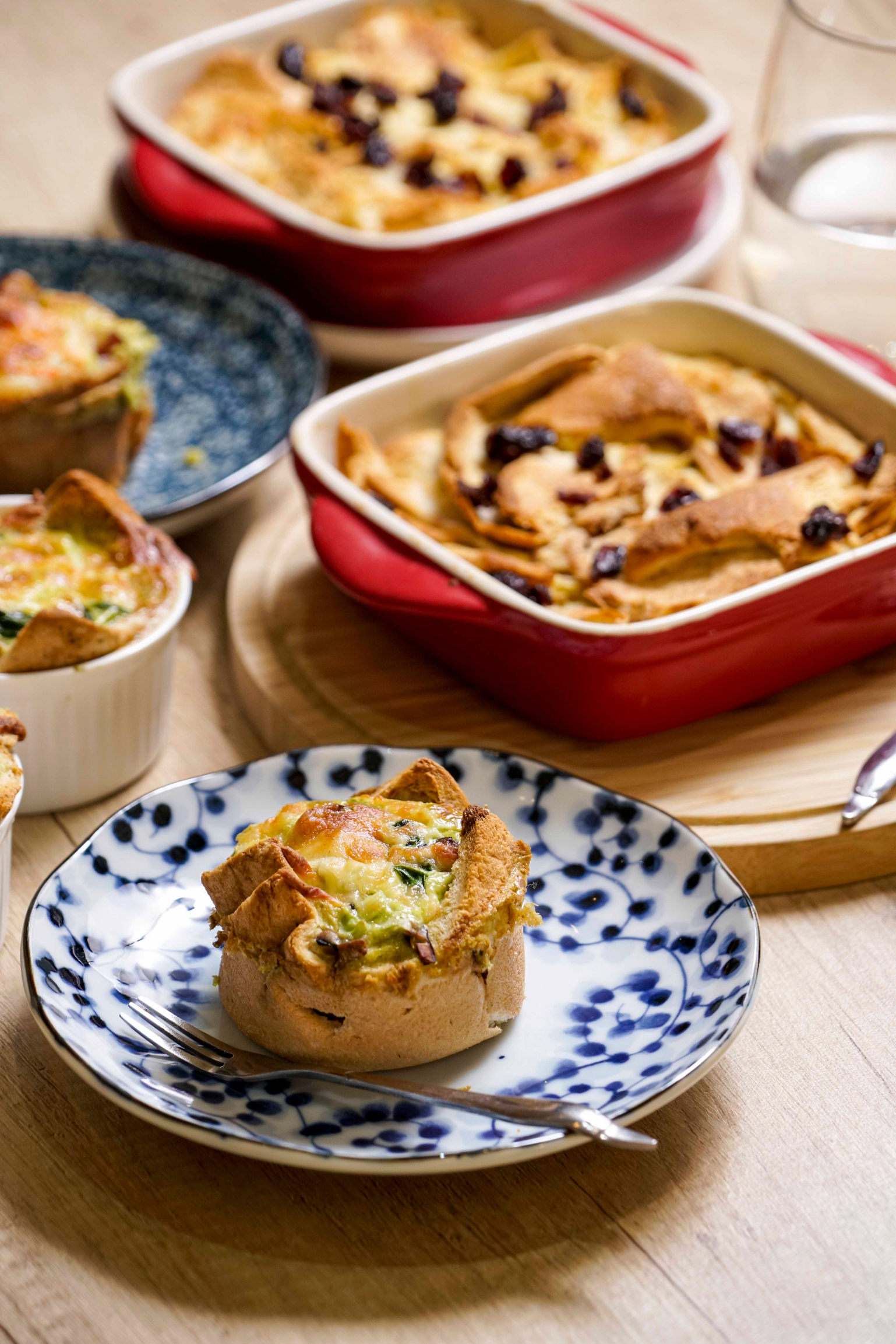 第二道「麵包布丁」則是英國經典的家常甜點,「酥脆的表皮、軟綿的內餡,一入口就能品嘗到類似蛋塔的口感。我們將普遍常見且有效期限短的麵包作為基底,顛覆麵包只能塗抹果醬或夾入餡料的想像,還能依每個人的愛好加入各式材料,簡單的製程適合大小朋友一起動手做。」
