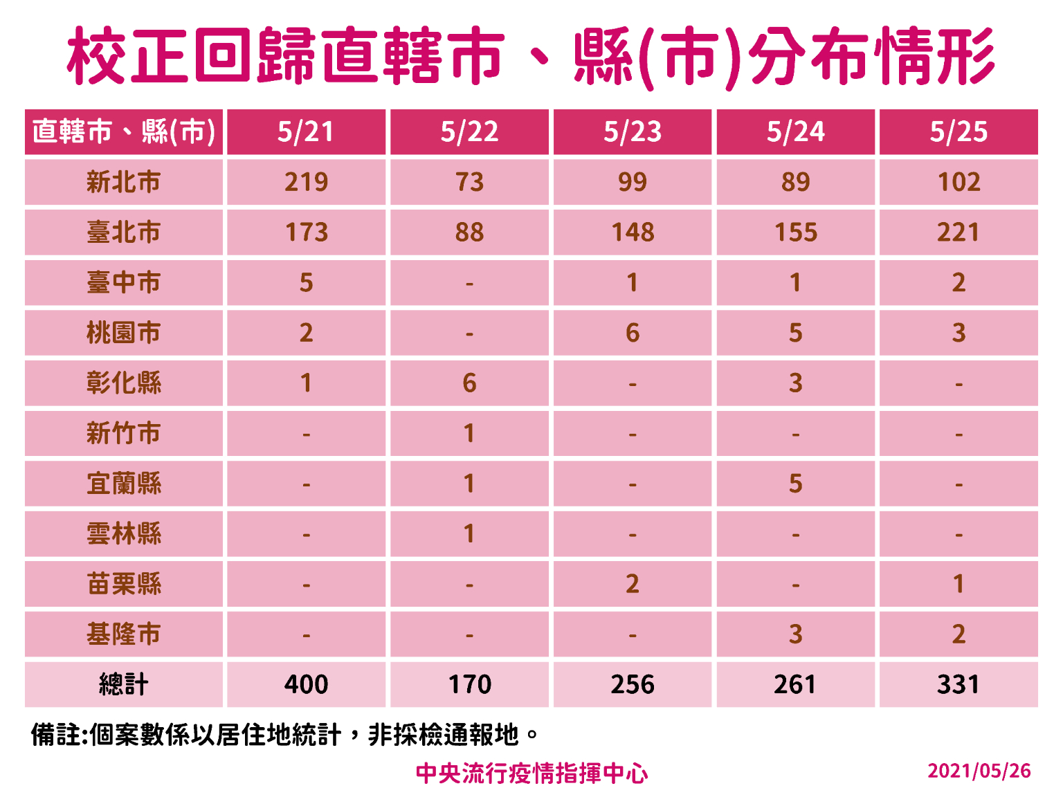 校正回歸個案331例中,為160例男性、171例女性,年齡介於未滿5歲至90多歲,發病日介於5月13日至5月25日;個案分布以臺北市221例最多,其次為新北市102例,桃園市3例,基隆市及臺中市各2例,苗栗縣1例。綜上所有個案,其中萬華活動史相關209例、茶藝館相關35例、某社團相關3例、其他已知感染源170例、關聯不明122例、疫調中94例。相關疫情調查持續進行中。