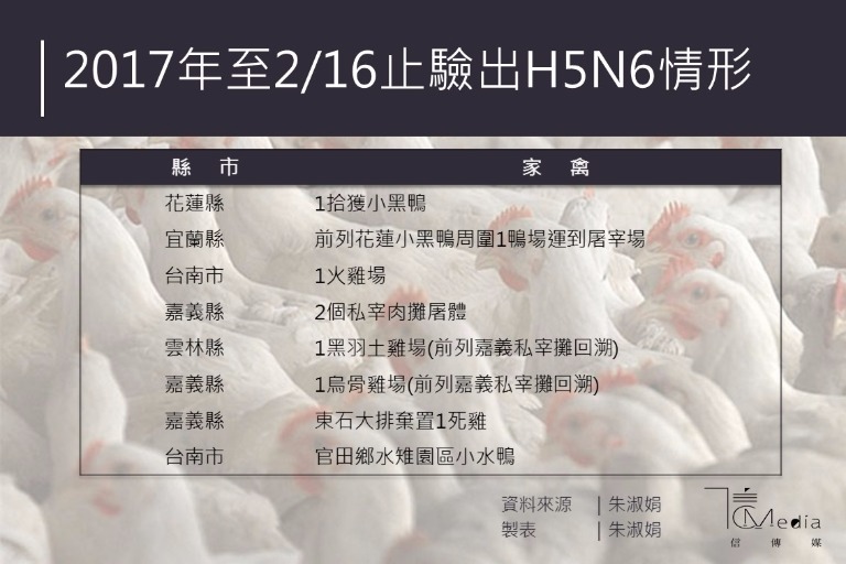 此外,當時農委會承諾要訂緊急應變手冊,而且要依當時的情況調整,例如本來防疫計畫是針對雞,後來疫情改變成鴨,防疫措施就要立即改變。這次H5N6到2月16為止,總計5縣市驗出,包括鴨、火雞、黑羽土雞、烏骨雞、還有小水鴨(鳥類),不知農委會是否已有因應各類家禽的緊急應變手冊。