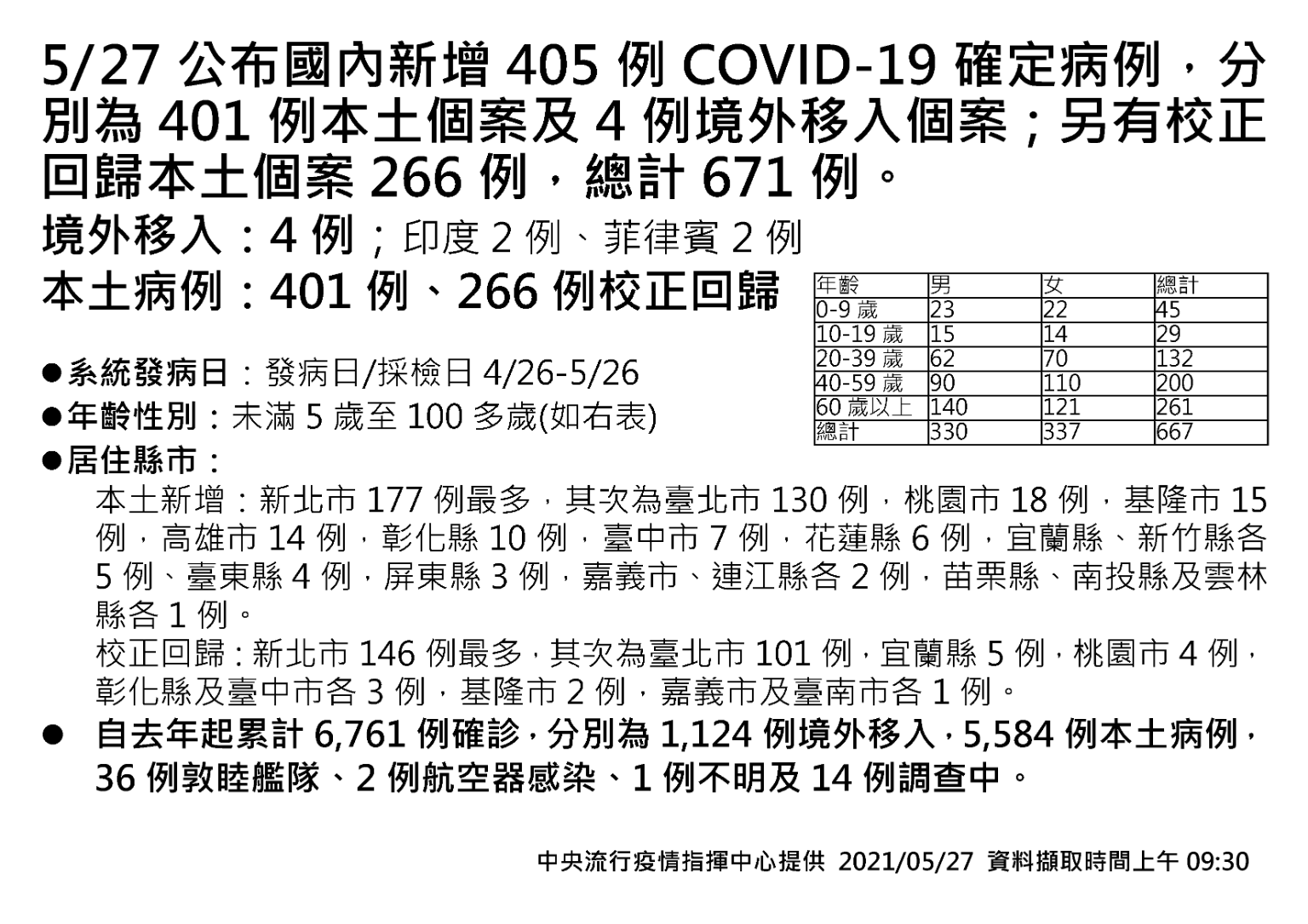 中央流行疫情指揮中心今(27)日公布國內新增405例COVID-19確定病例,分別為401例本土個案及4例境外移入個案;另有校正回歸本土個案266例,總計671例。確診個案中新增13例死亡。