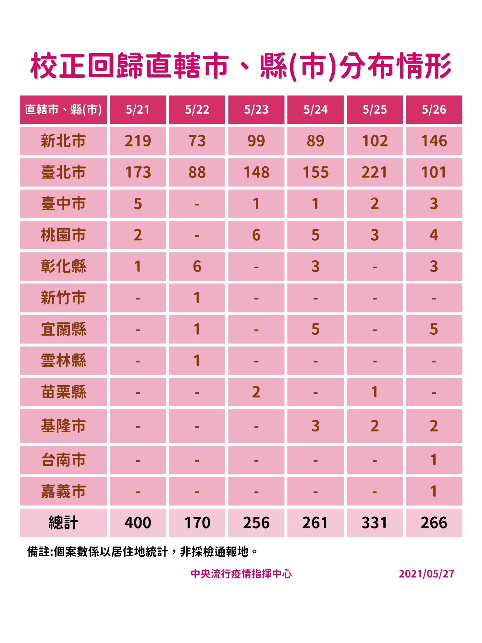 指揮中心指揮官陳時中表示,今日新增之401例本土病例,為190例男性,211例女性,年齡介於未滿5歲至100多歲,發病日介於今年4月26日至5月26日;個案分布以新北市177例最多,其次為臺北市130例,桃園市18例,基隆市15例,高雄市14例,彰化縣10例,臺中市7例,花蓮縣6例,宜蘭縣、新竹縣各5例、臺東縣4例,屏東縣3例,嘉義市、連江縣各2例,苗栗縣、南投縣及雲林縣各1例。