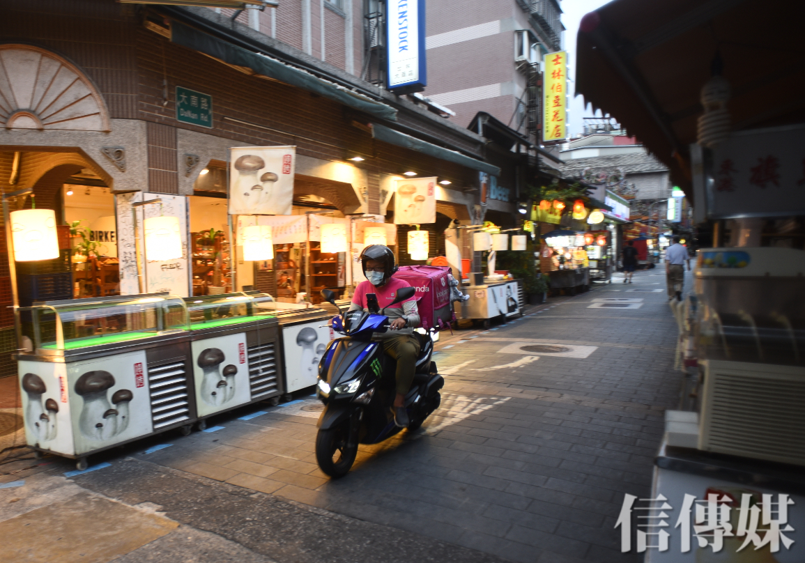 到了傍晚的士林夜市,僅剩外送員騎著摩托車於巷弄穿梭。(攝影/趙世勳)