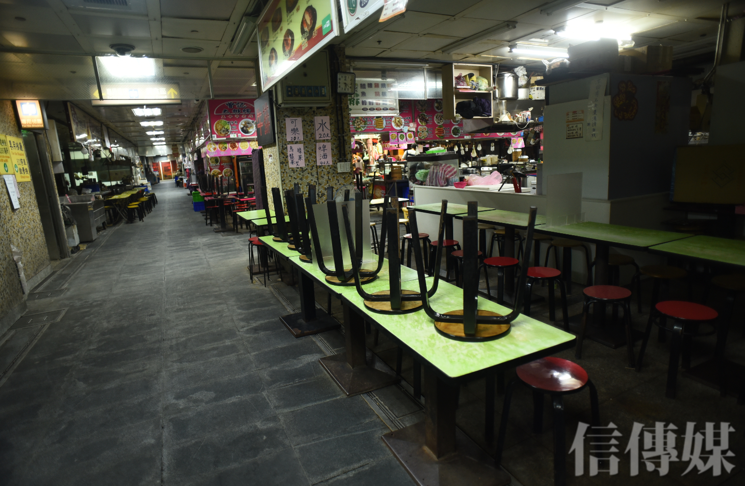 士林夜市美食地下街遵守防疫政策,索性將內用桌椅收拾倒立。(攝影/趙世勳)