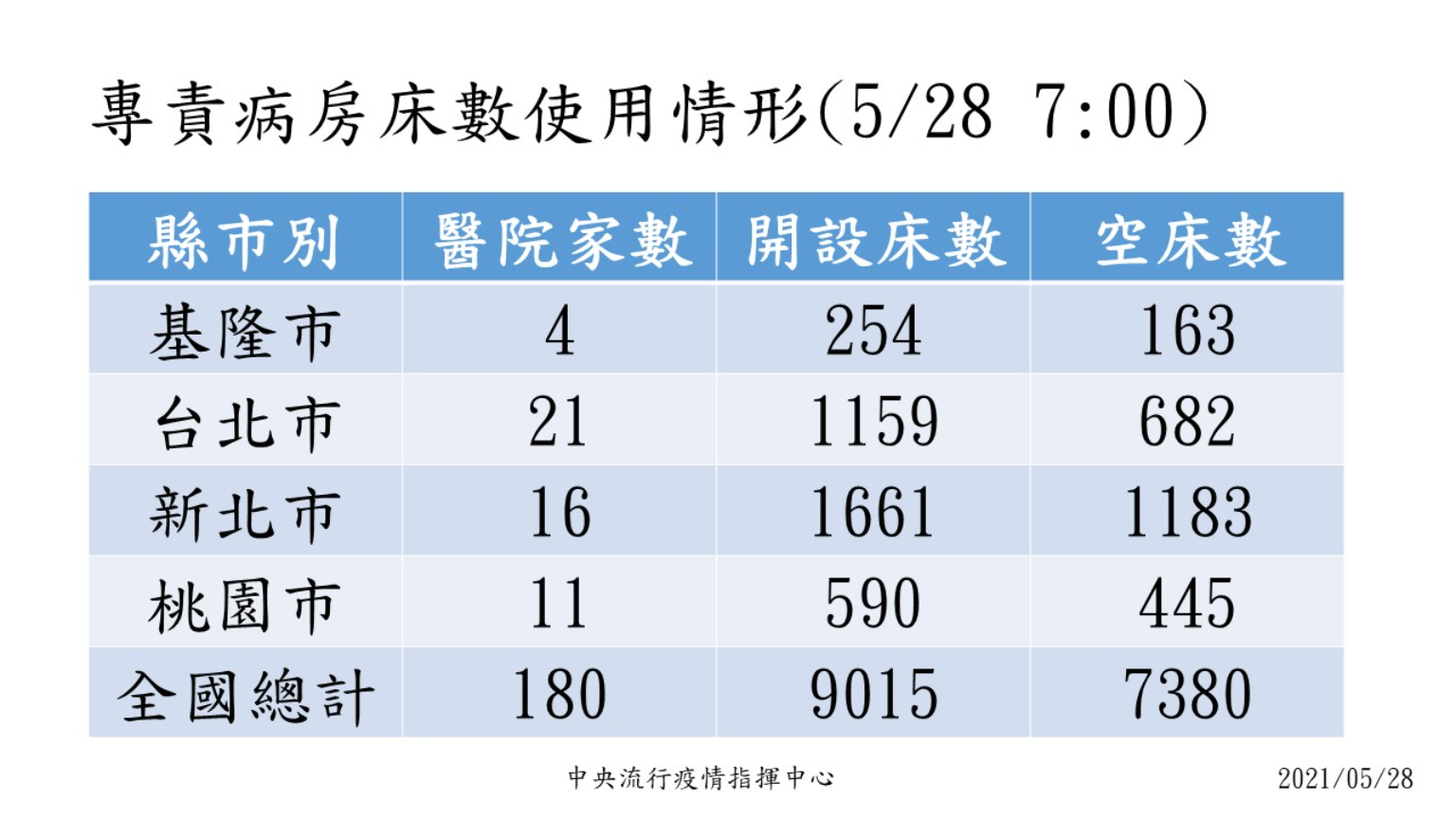 指揮中心在記者會中提供專責病房與負壓隔離病房使用情形。衛福部次長石崇良表示,過去用比較高的規格用一人一室收治,所以有發生量能不足的情形,後來經過討論,過去收治的可能是疑似個案,現在是確診才入院,之後量能還是有提升上來。