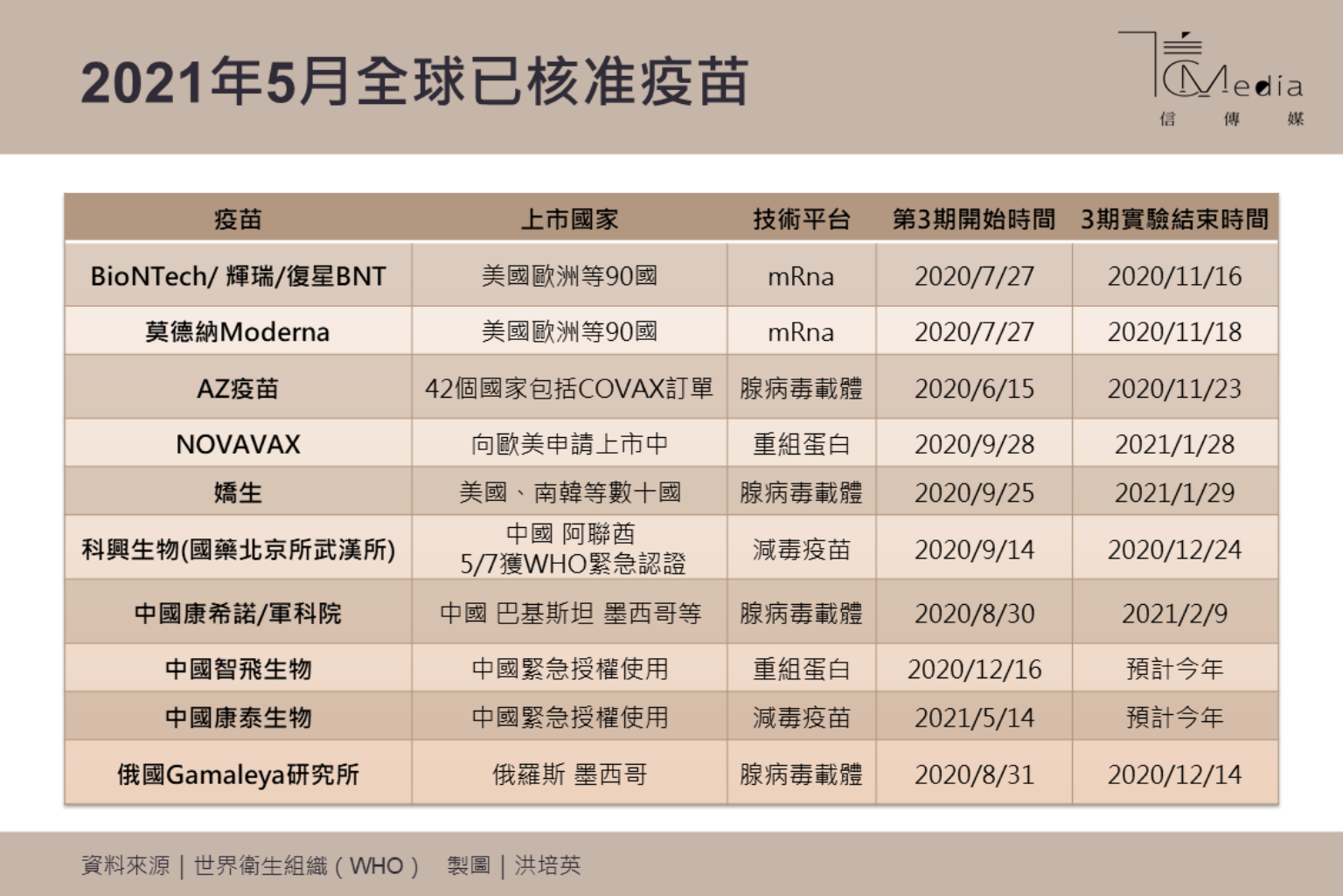 根據WHO的統計,到今年5月底為止,緊急授權共10支疫苗上市,包括知名的莫德納、輝瑞BNT、AZ、諾華(剛通過)、強生,有超90個以上國家排隊等候莫德納的mRNA疫苗及輝瑞BNT疫苗(也是mRNA 技術平台),40個國家在等AZ疫苗,另外中國5支疫苗以中國市場為主,俄羅斯開發的疫苗也僅在俄國和墨西哥上市。