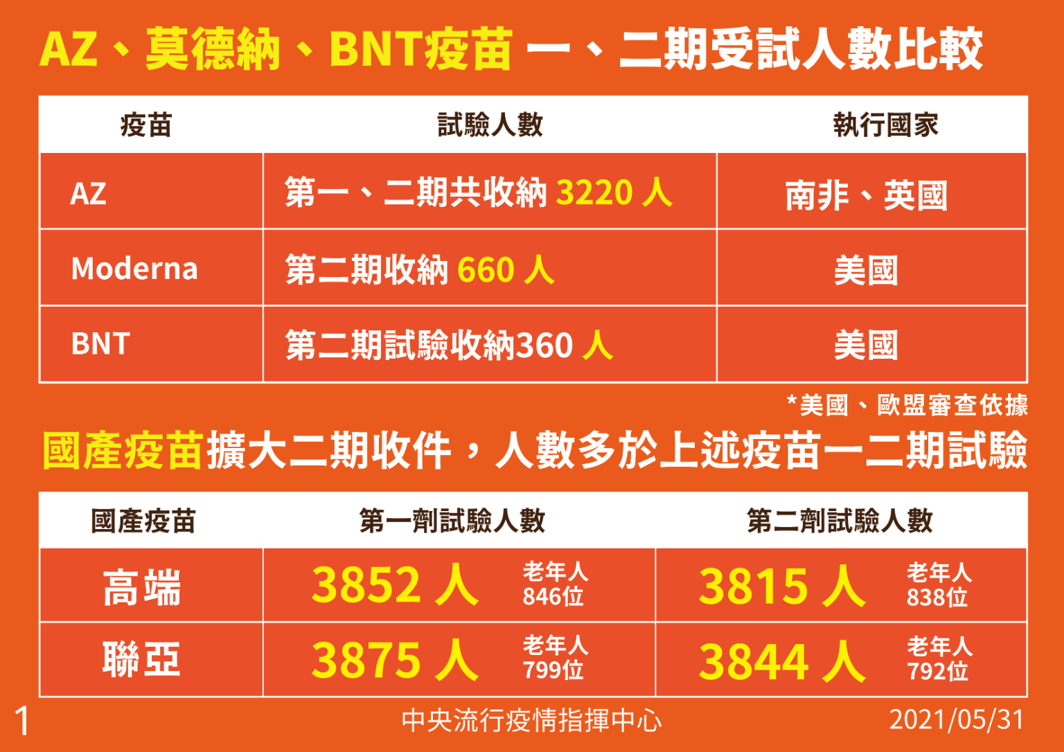 另外,關於昨日指揮中心拿出AZ、莫德納與BNT疫苗,指出這3支疫苗第一、二期收納人數都不如國產疫苗人數多,卻不提3支疫苗獲得緊急使用授權時已經是第三期臨床試驗的中期,人數遠遠超過國產疫苗也遭質疑。