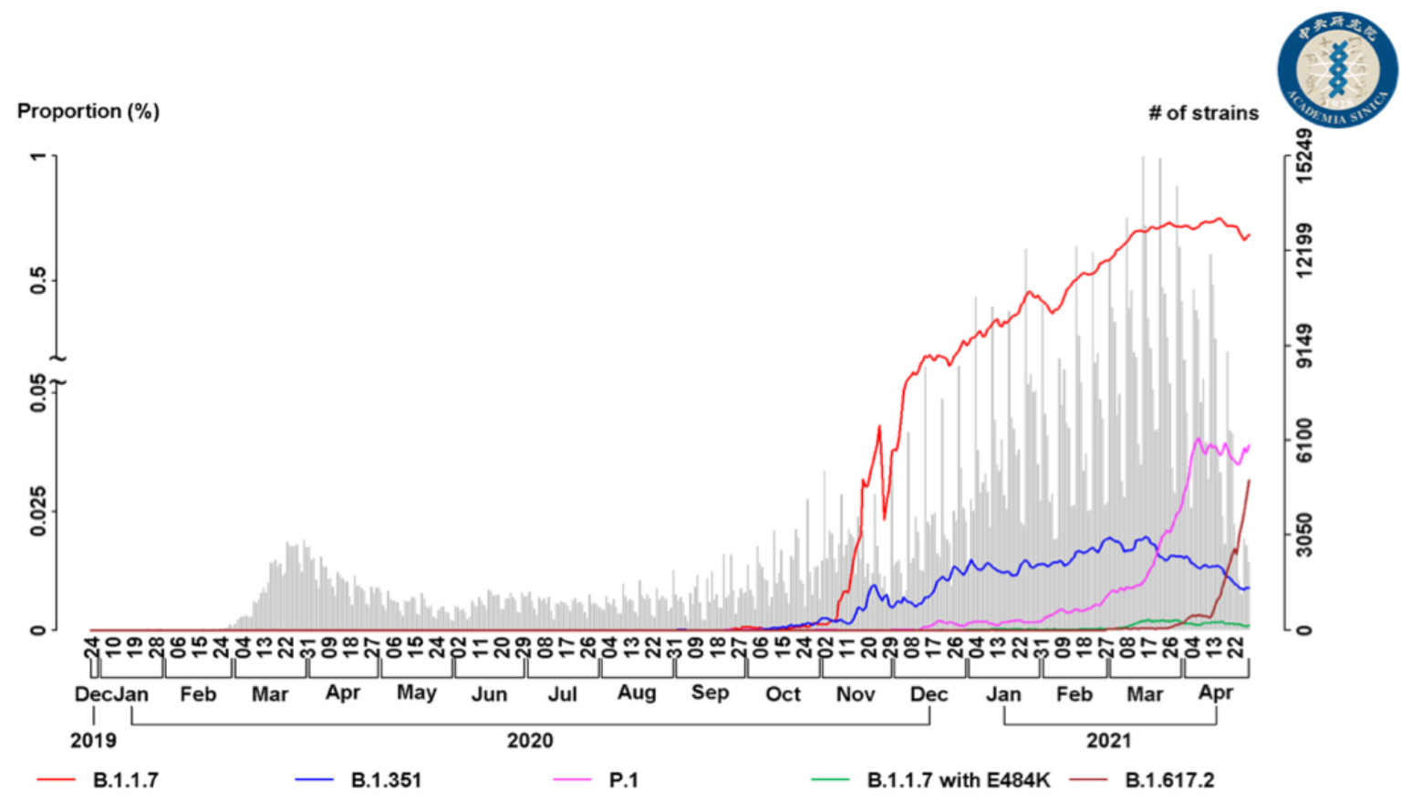 中研院也分析來自全球共享流感數據倡議組織(GISAID)資料庫上超過120萬筆的新冠病毒基因序列資料,得到這5株深受關切的變異株發生頻率的時間動態趨勢。