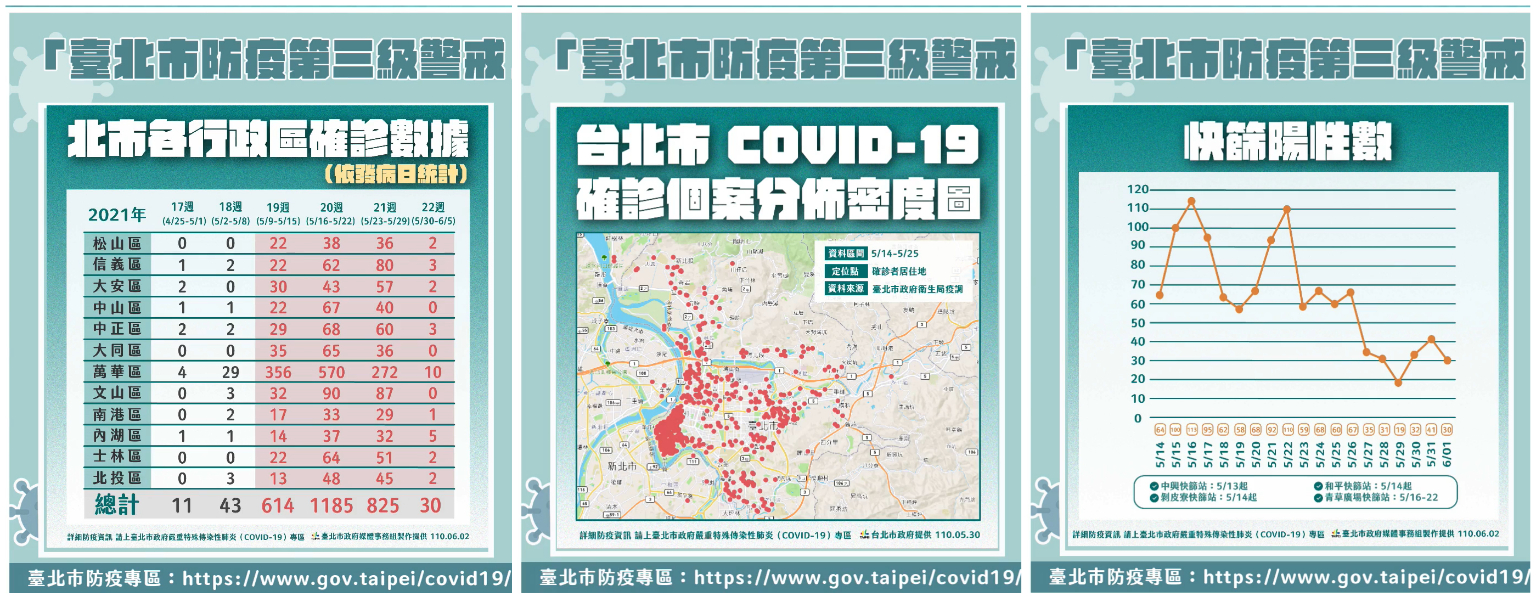 北市疫情是從萬華區擴散至其他11個行政區,柯文哲警告,「發生在台北的事情,三個星期後就會發生在整個台灣」,即病毒從雙北大規模擴散至其他縣市。