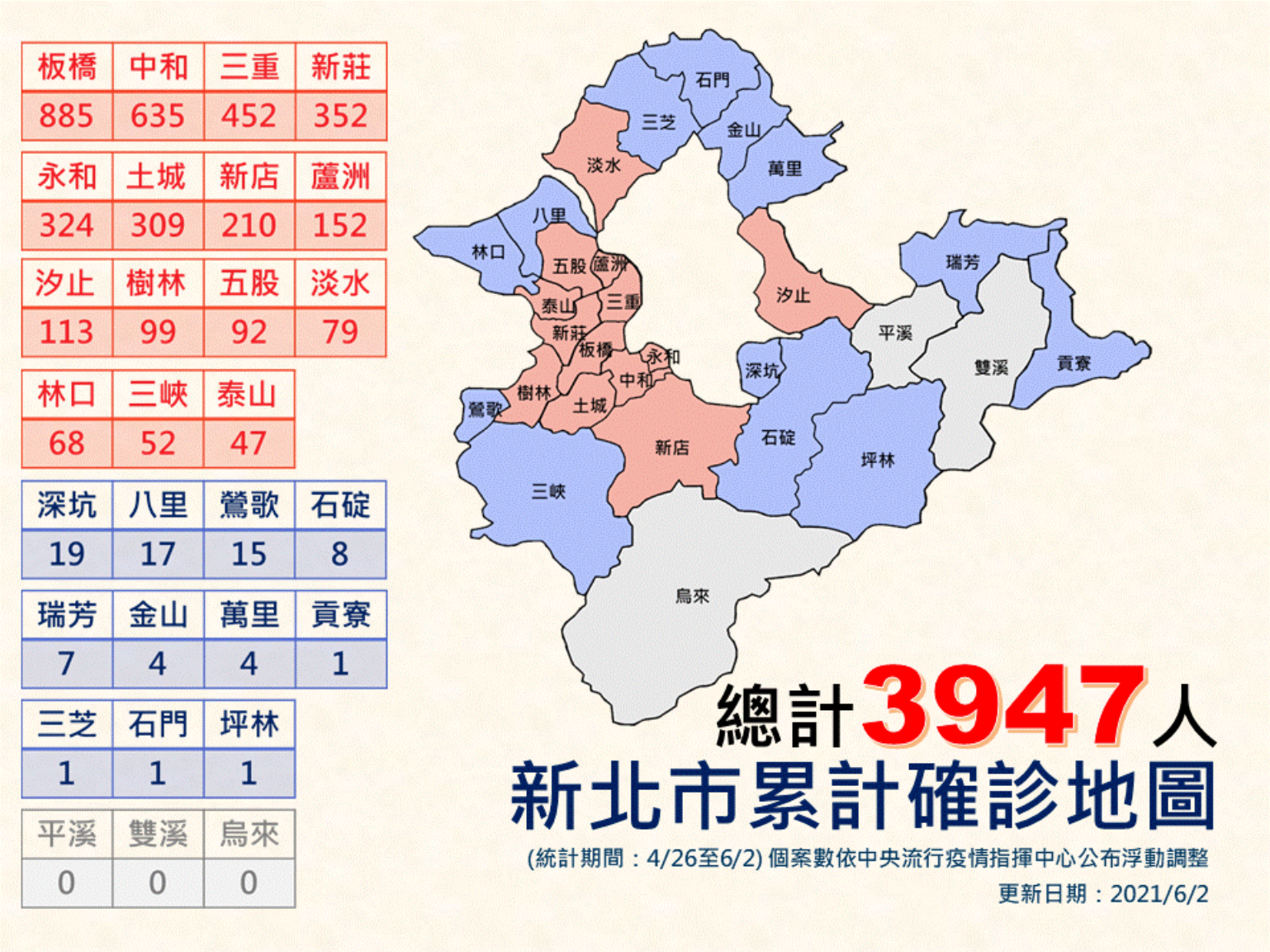 中央流行疫情指揮中心宣布,新北市2日新增195例本土及115例校正回歸,總計310例,行政區中以板橋區39人為最多,總累積3947例確診,列管為居家隔離者6402人。