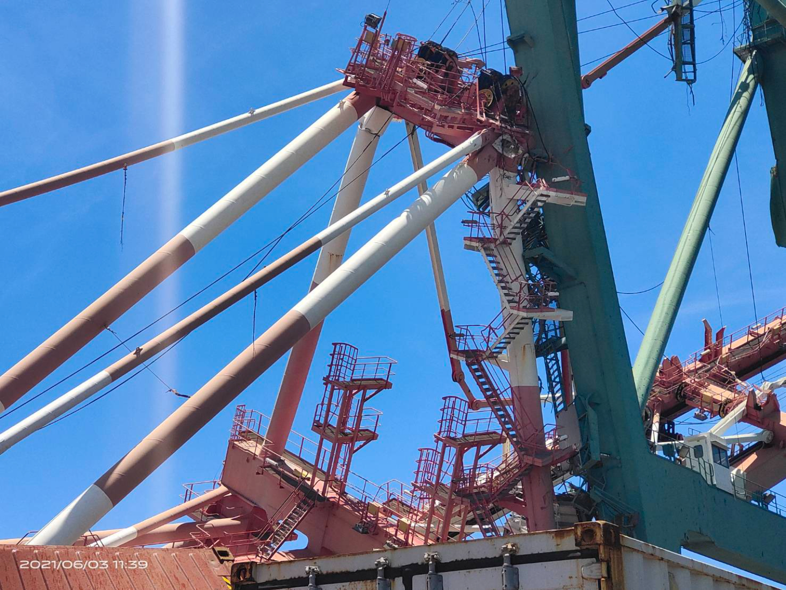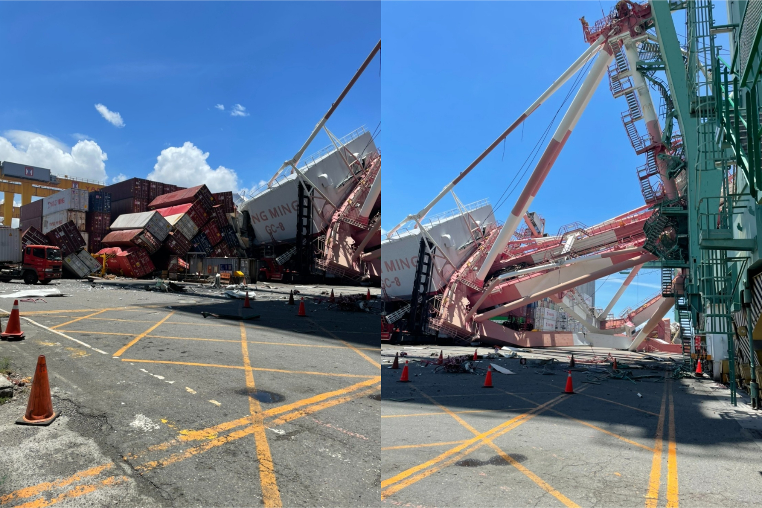 起重機坍塌導致多個貨櫃掉落,現場一度相當危險,也激起大量塵霧。