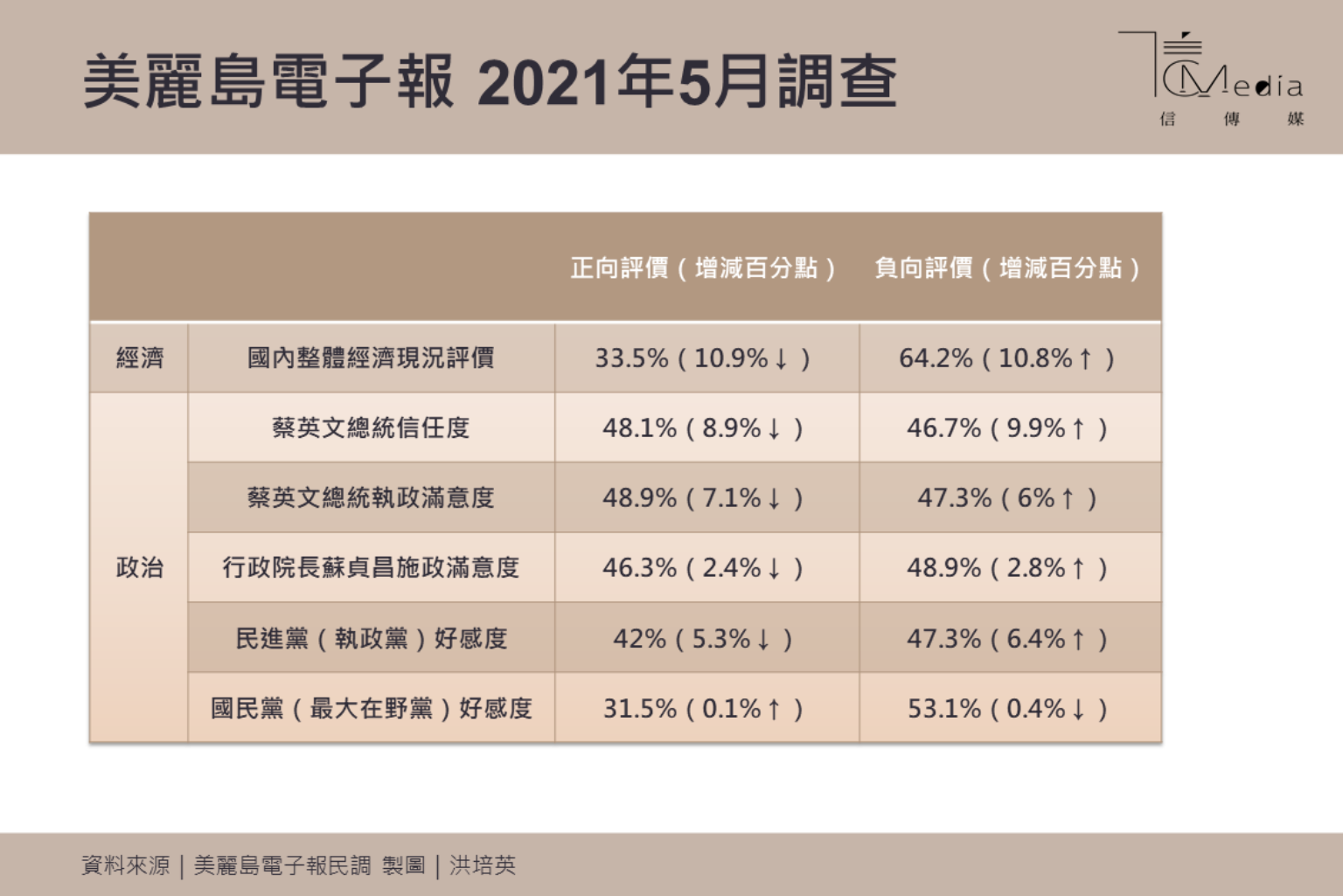 5月歷經武漢肺炎確診人數飆高、疫苗之亂事件,美麗島電子報最新國政民調出爐,總統蔡英文的信任度、執政滿意度雙雙跌破50%,為2019年11月以來首度低於50%,對防疫表現打分在及格60邊緣。