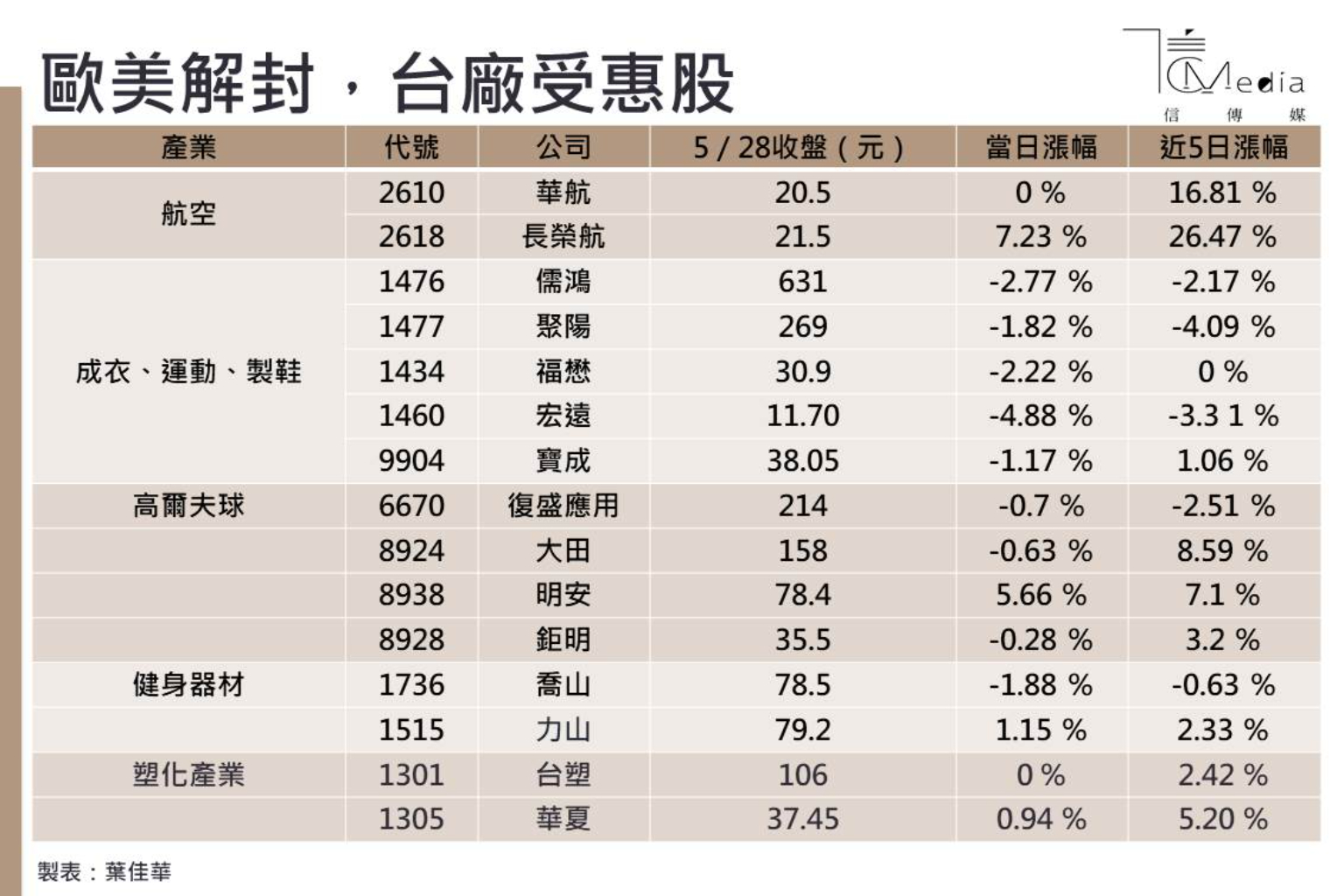 台股當中,歐美解封概念股成衣、製鞋、高爾夫球相關,包括有儒鴻、聚陽、福懋、宏遠、寶成、復盛、大田、明安、鉅明以及健身器材的喬山、力山等。
