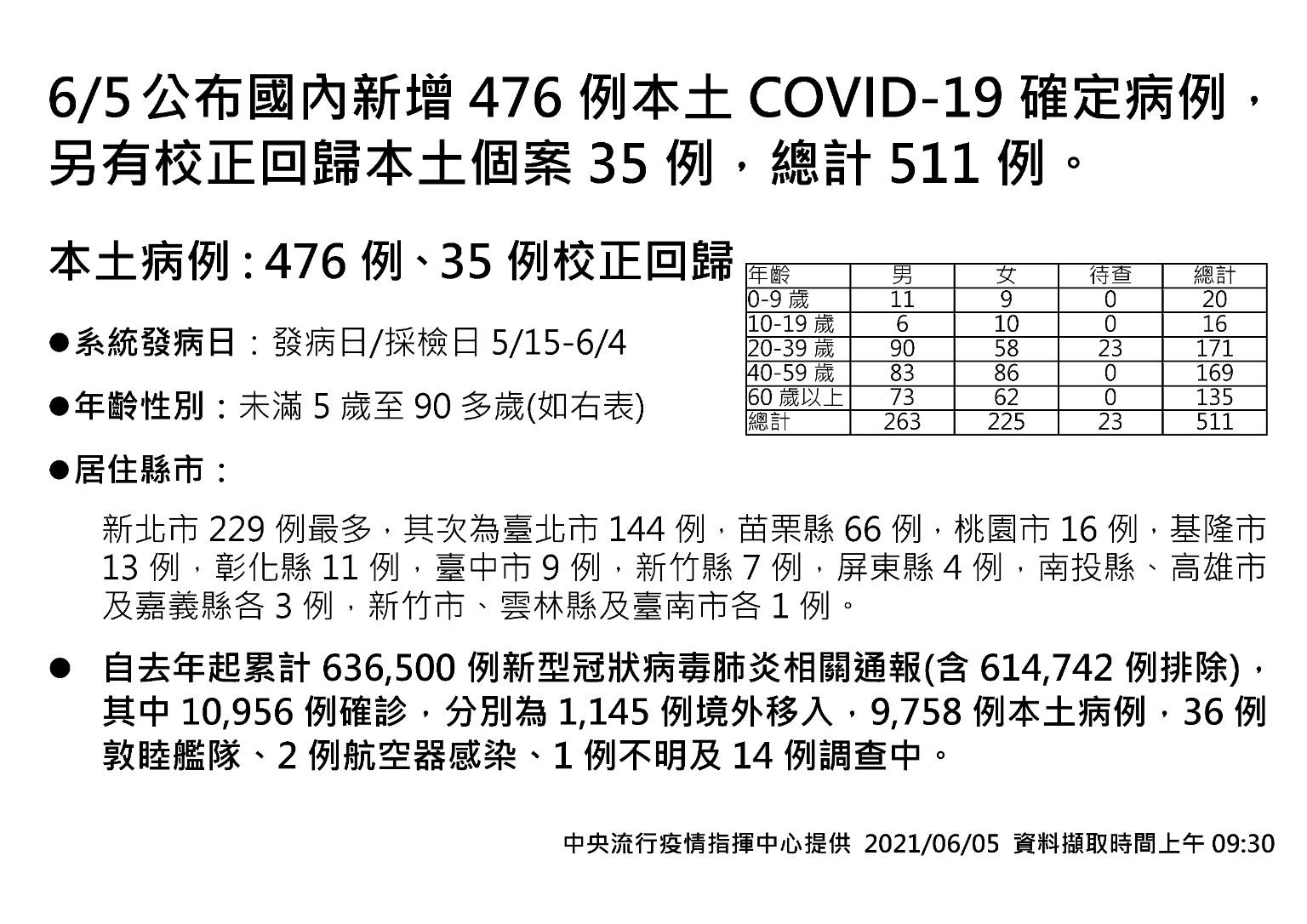 指揮中心指揮官陳時時中表示,今日新增之476例本土病例,為248例男性、205例女性,另有23例外籍人士性別待確認,年齡介於未滿5歲至90多歲,發病日介於今年5月15日至6月4日。另校正回歸個案35例中,為15例男性、20例女性,年齡介於未滿10歲至80多歲,發病日介於今年5月24日至6月1日。
