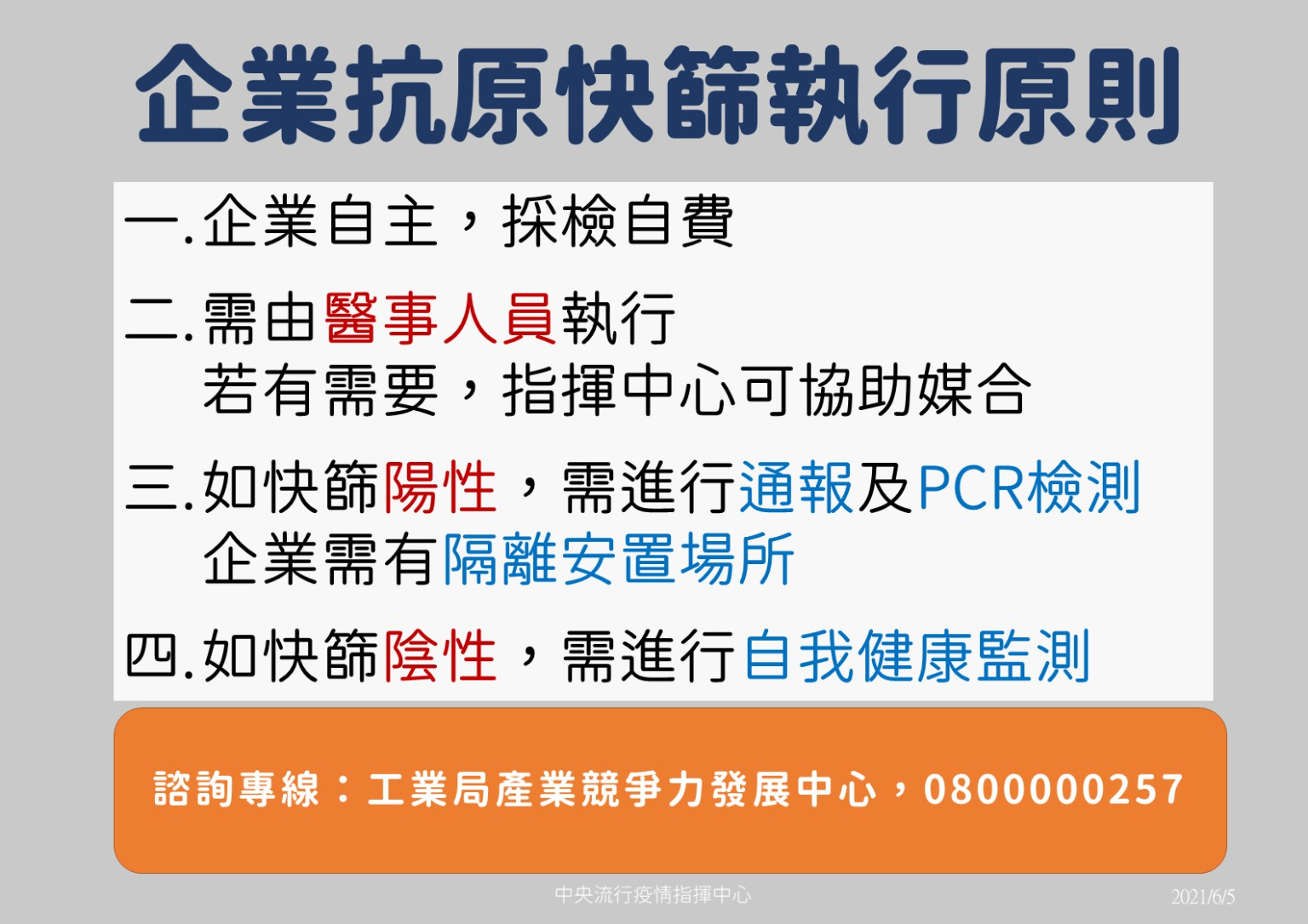 一、加速篩檢執行:昨日經動員後於第1家電子公司共開設18條篩檢線,每小時可執行350-500人次篩檢,截至昨日(6/3-6/4)共完成採檢4,599人,累計抗原快篩陽性59人,其中PCR檢驗共56人陽性確診、3人陰性。今日進行其餘約2,451人之採檢,截至中午尚餘約1,500人待採,將於今日完成採檢工作。