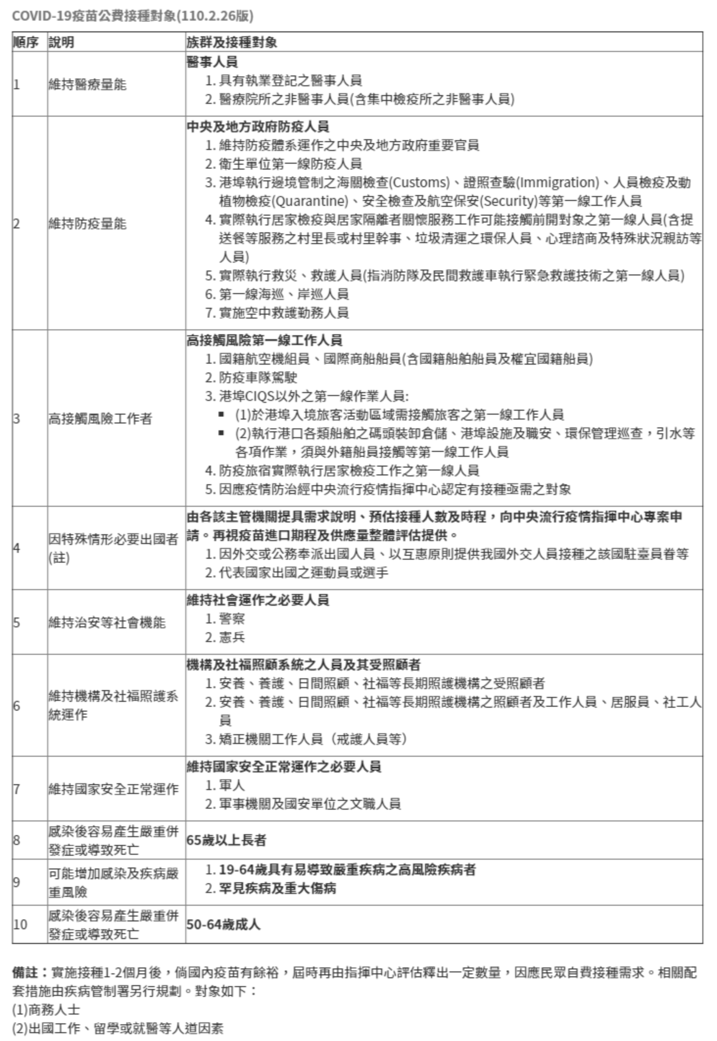 另有不具名國民黨立委建議,「公費疫苗接種對象順序」或可明定係依據《特殊嚴重傳染性肺炎防治特別條例》第7條所制定,這樣就可以援引同法第16條第3款規定,由中央目的事業主管機關、直轄市、縣(市)政府,對於違規者處新台幣5萬元以上100萬元以下罰鍰。