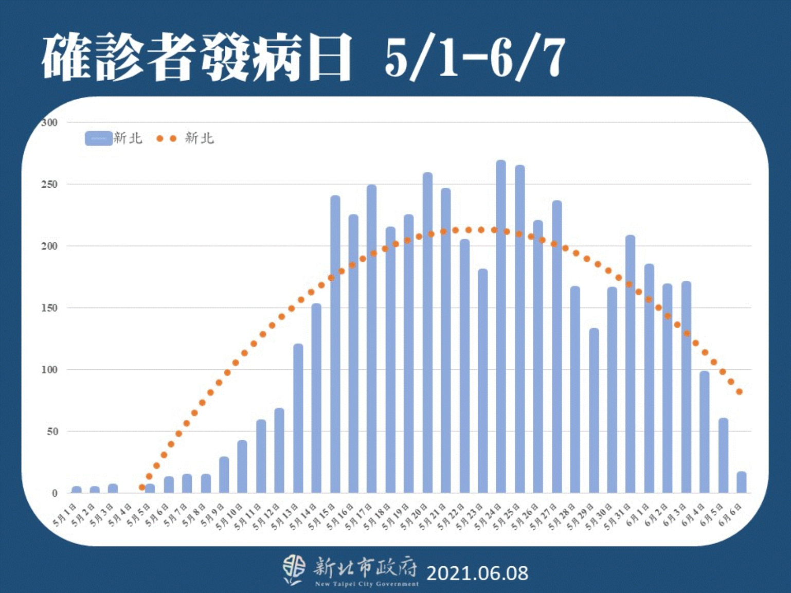 侯友宜認為,每天看當天確診者人數其實是落後指標,更不應該用一天的數據來評斷疫情趨勢,因此他搬出了新北市確診者發病日統計數據做說明,從長條圖可以看到5月1日到6月7日整體趨勢是由低到最高點,而後慢慢往下掉。