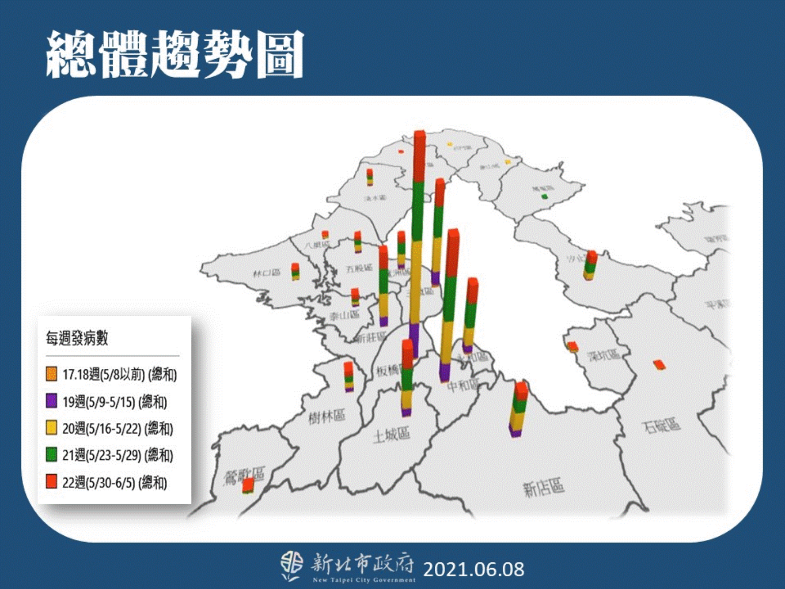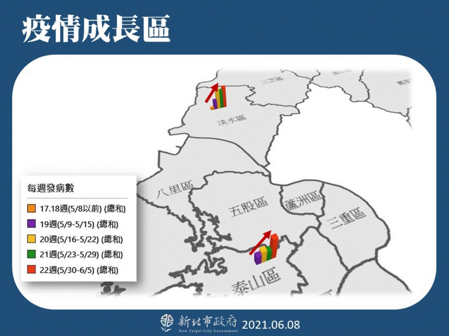 因此新北市以這幾個行政區域為中心,輻射狀向外加強防疫,而其中,從每週發病數來看,侯友宜特別點名「泰山、淡水」的發病數有出現成長趨勢,必須多加注意。