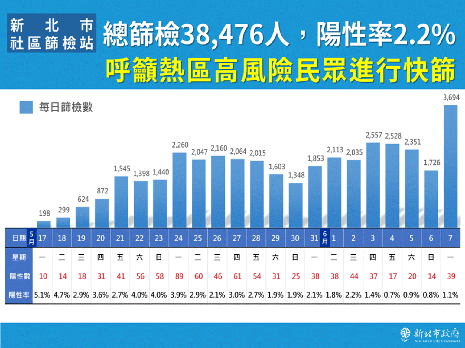目前新北篩檢量達3萬8476例,陽性率2.2%,侯友宜持續呼籲高風險熱區民眾出來快篩,並表示目前就靠著呼籲廣篩,篩出841例陽性但尚未發病的確診個案,昨天篩檢人數3694人,就篩到39人陽性,以無症狀確診者居多,但六日篩檢人少,加總起來僅抓出34人,這些無症狀確診者都隱藏在社區裡面,成為隱性感染源,侯友宜呼籲,在熱區的市民要出來廣篩,更高喊「市長不怕公布數字高,就怕民眾不出來篩檢」,疫情看起來雖有舒緩,但不能放鬆。