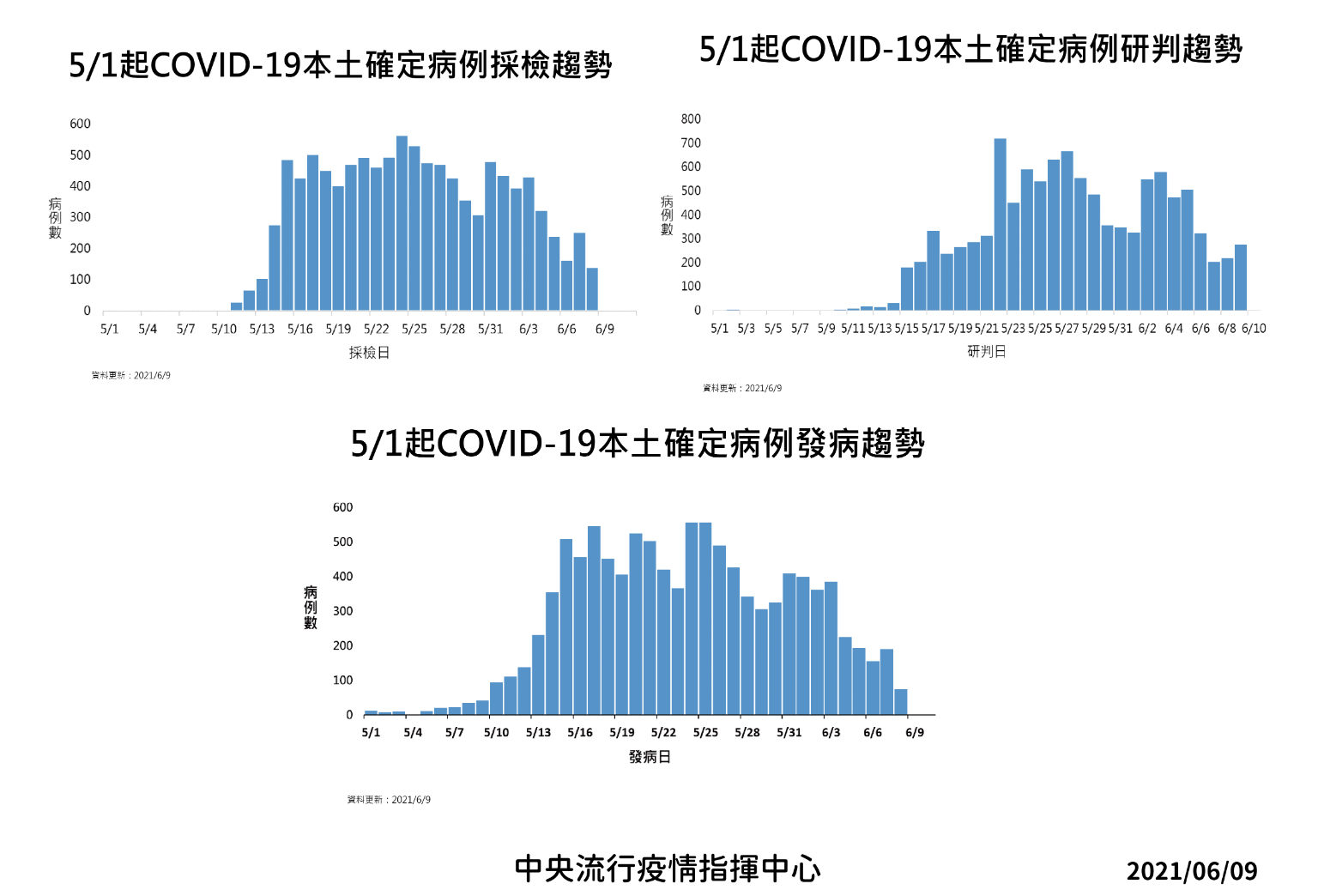 指揮中心指揮官陳時中表示,今日新增之274例本土病例,為142例男性、132例女性,年齡介於未滿5歲至90多歲,發病日介於今年5月14日至6月8日。個案分佈以新北市162例最多,其次為臺北市63例,桃園市15例,苗栗縣12例,基隆市10例,彰化縣及南投縣各3例,宜蘭縣2例,臺南市、嘉義市、臺中市及新竹縣各1例。其中雙北地區以外縣市49例中,43例為已知感染源,6例關聯不明。相關疫情調查持續進行中。