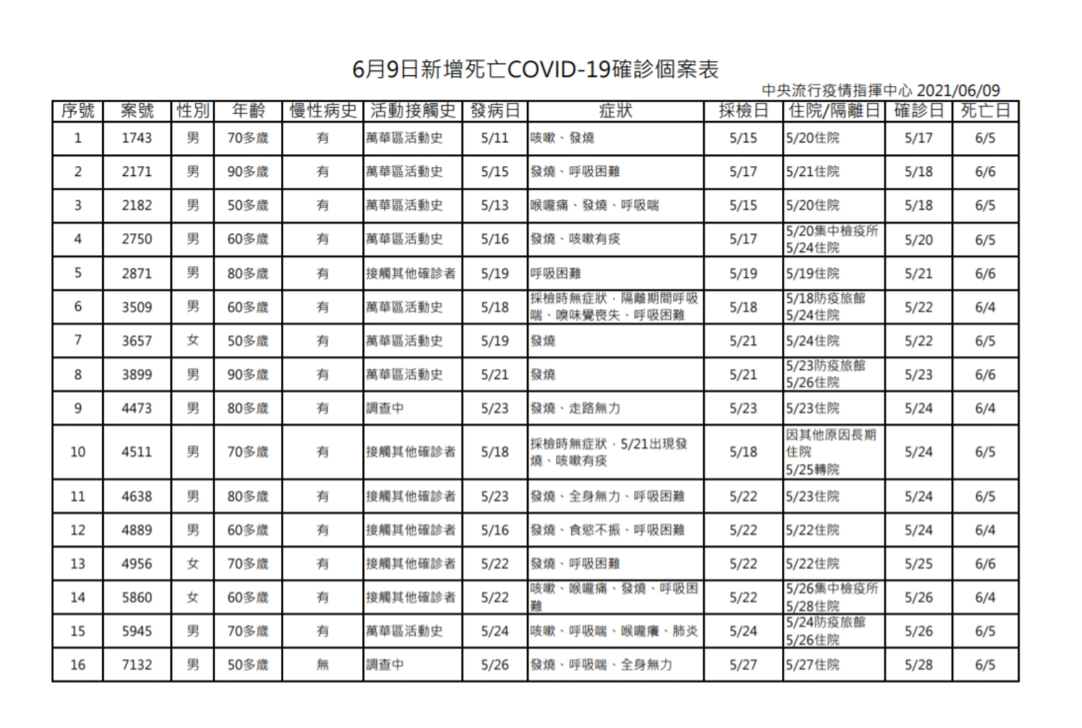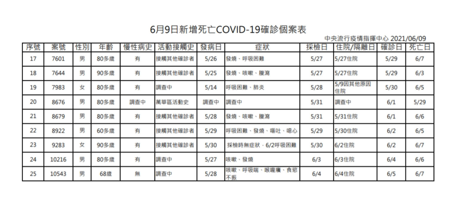 陳時中說明,今日新增25例死亡個案,共計為男性20位、女性5位,年齡介於50多歲至90多歲,發病日介於5月11日至5月30日,確診日介於5月17日至6月5日,死亡日介於5月29日至6月7日,詳如新聞稿附件。