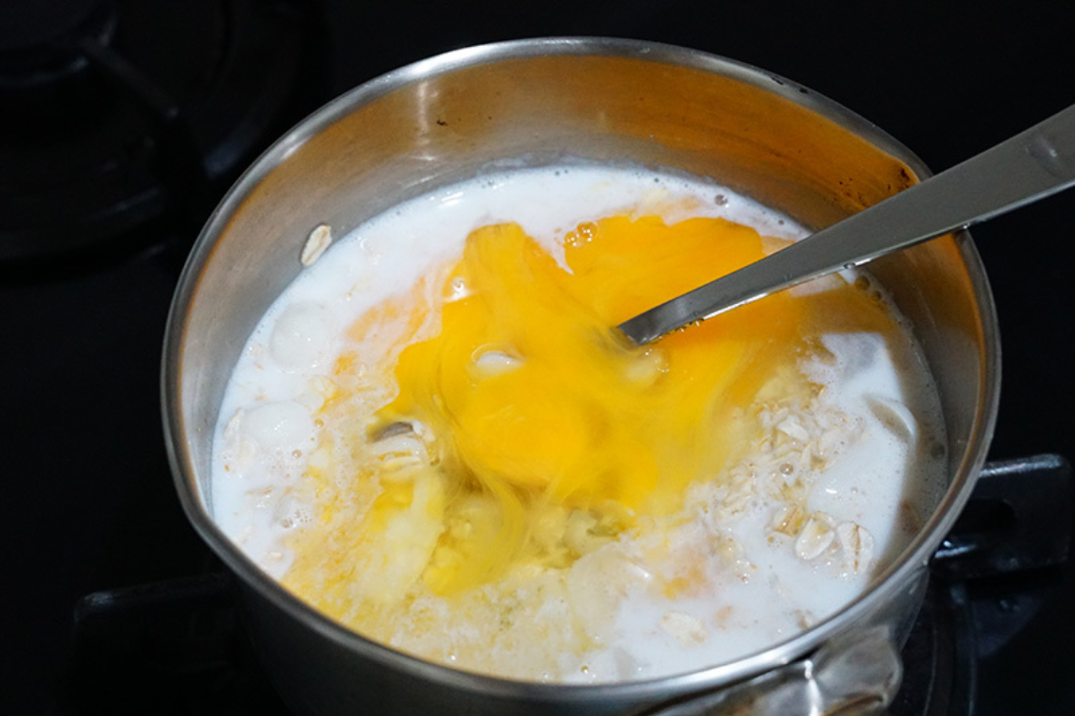 關火後在加入即食燕麥片,稍加攪拌後,再倒入蛋汁。
