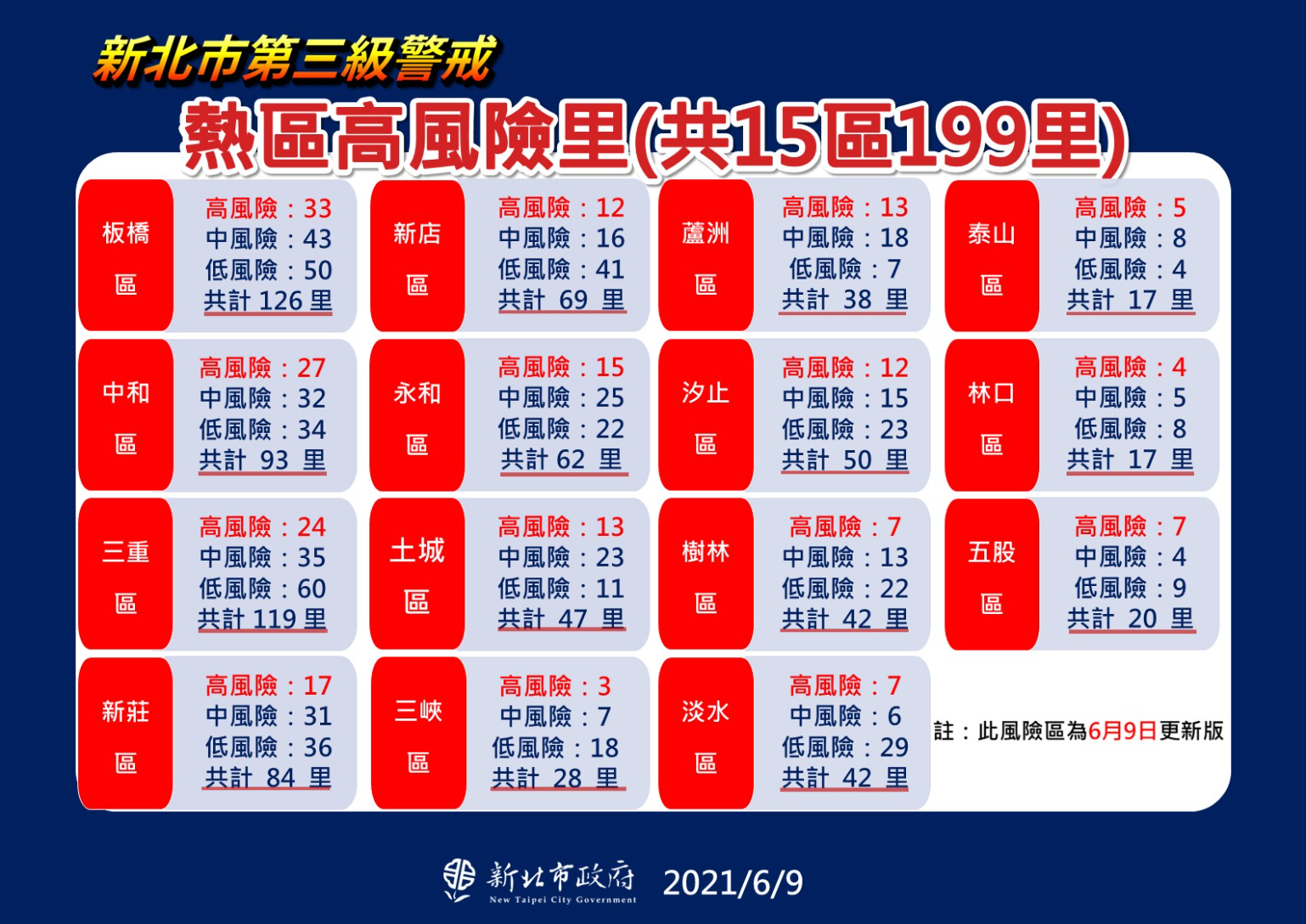 侯友宜表示,高風險熱區15區共有199個高風險里、281中風險里與374低風險里,市府方面已經做了一些滾動式調整,將48個高風險里降為中風險里、37中風險里調升為高風險里,他也不厭其煩再次呼籲高風險里出來廣篩,中低風險里要保持低度活動。