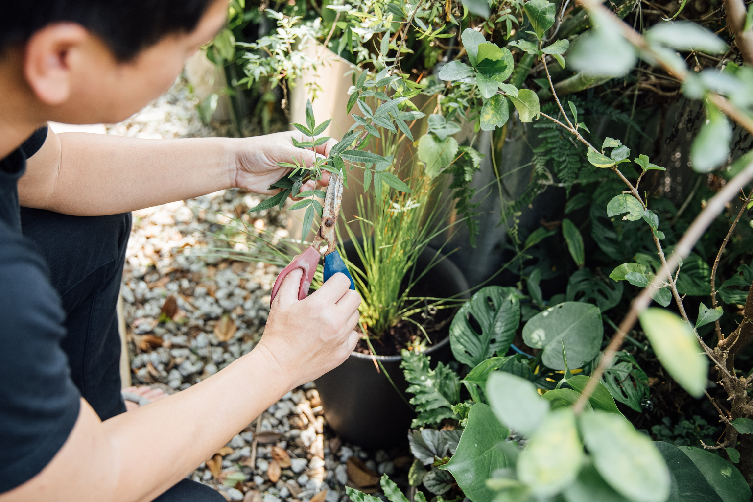 若想達到在綠蔭下休憩的愜意,則可選擇2至3公尺高、低開枝的單幹喬木,才有開展的樹冠,像是台灣原生種田代氏石斑木,每到春天會盛放中心帶點粉紅的雪白小花,花期長達兩個月,且耐強風、抗旱的特性,也適合種植於高樓層的陽台。吳書原提醒,不管是哪種植物,種植方式皆以單盆為原則,如此才能根據日照移動位置,找出植物受光的最佳居所,而且也較方便觀察盆內的土壤根系,以便及時遏止病蟲害。
