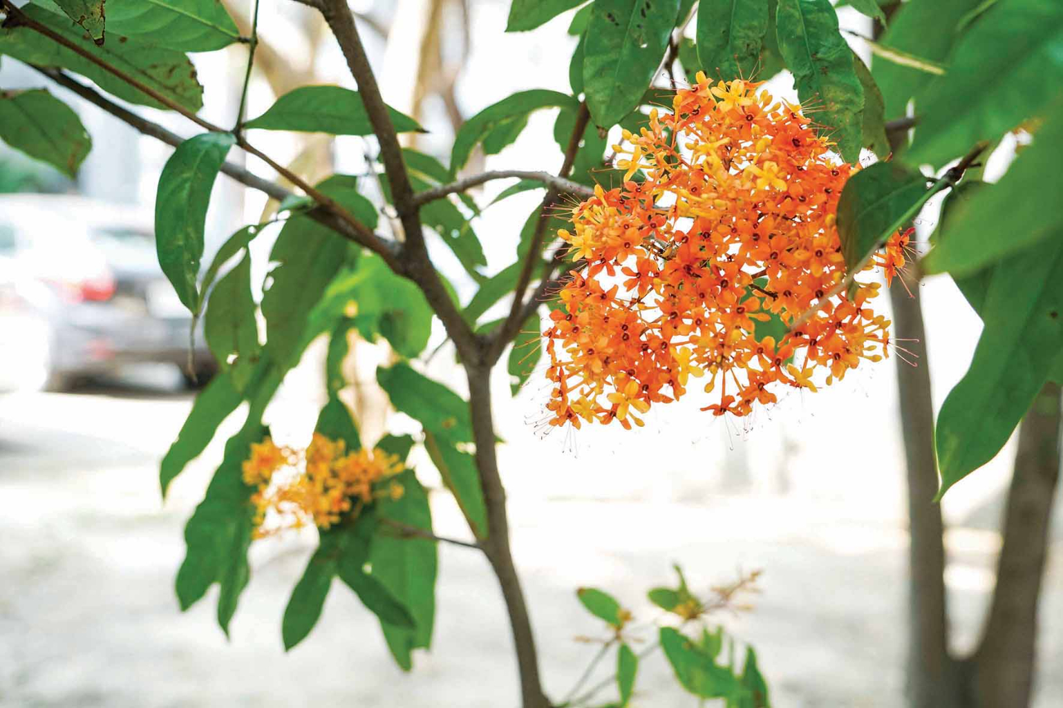 春天,多種植物進入花期,正是欣賞的好時節。「走!我帶你們去看一棵特別的樹!」沿著椰林路往內走,在森林系館旁,有一株盛開橘紅色花朵的無憂樹,雖然不高,但花卻開得茂盛而燦爛,每一小叢都像是綻放的煙火。