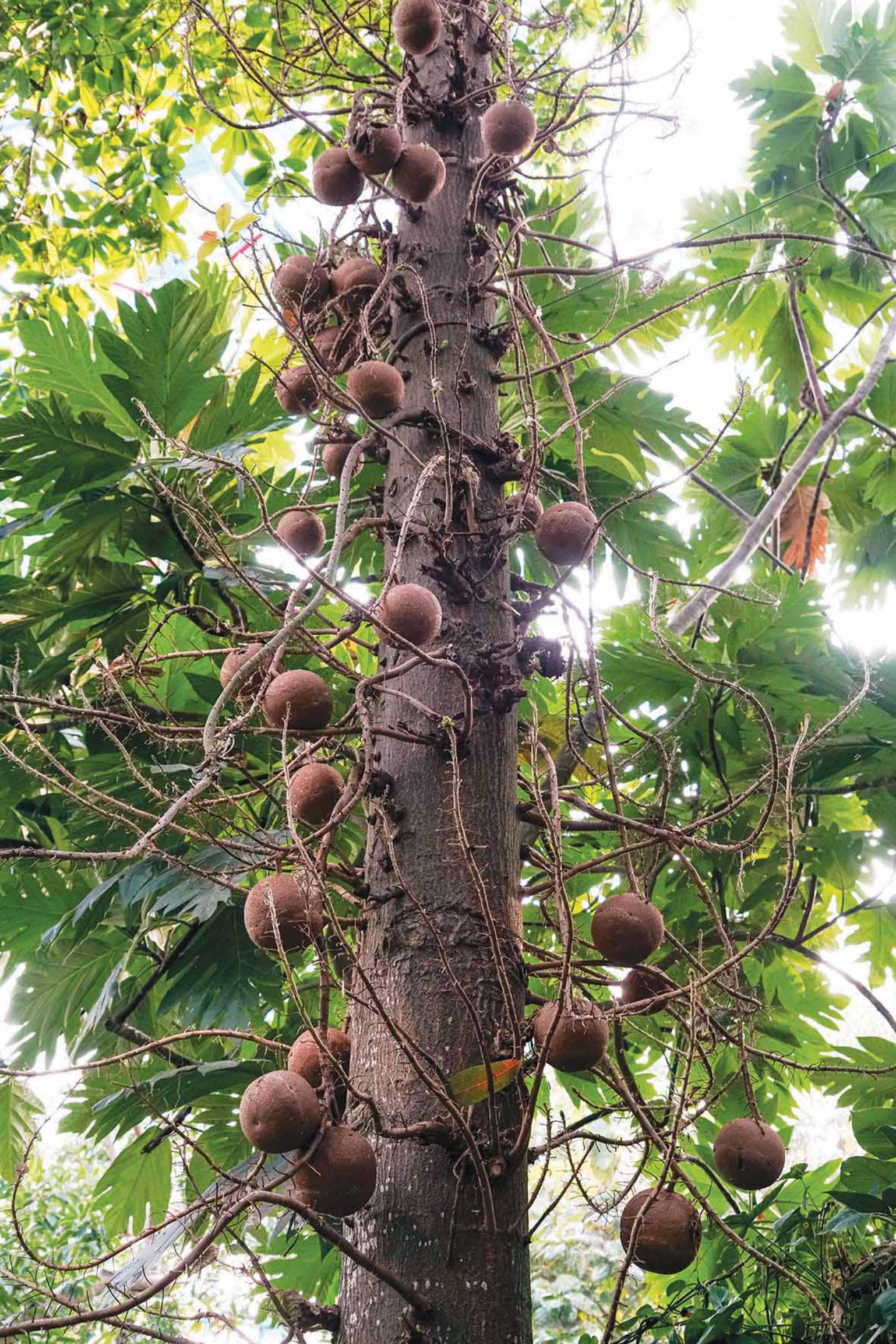 另外,特別的幹生花也是熱帶雨林植物的特徵之一。由於熱帶雨林終年高溫多雨,一整年都是生長季,通常花芽生長速度較葉芽慢,當花芽轉為花蕾時,生長迅速的莖已經成了樹幹,因此產生花朵綻放於樹幹的獨特現象,在科博館植物園的玻璃溫室,就可以見到開出幹生花的砲彈樹,花朵造型奇特,顏色豔麗散發香味,果實也直接結在樹幹上,褐色球形,一顆顆就像是砲彈一樣。