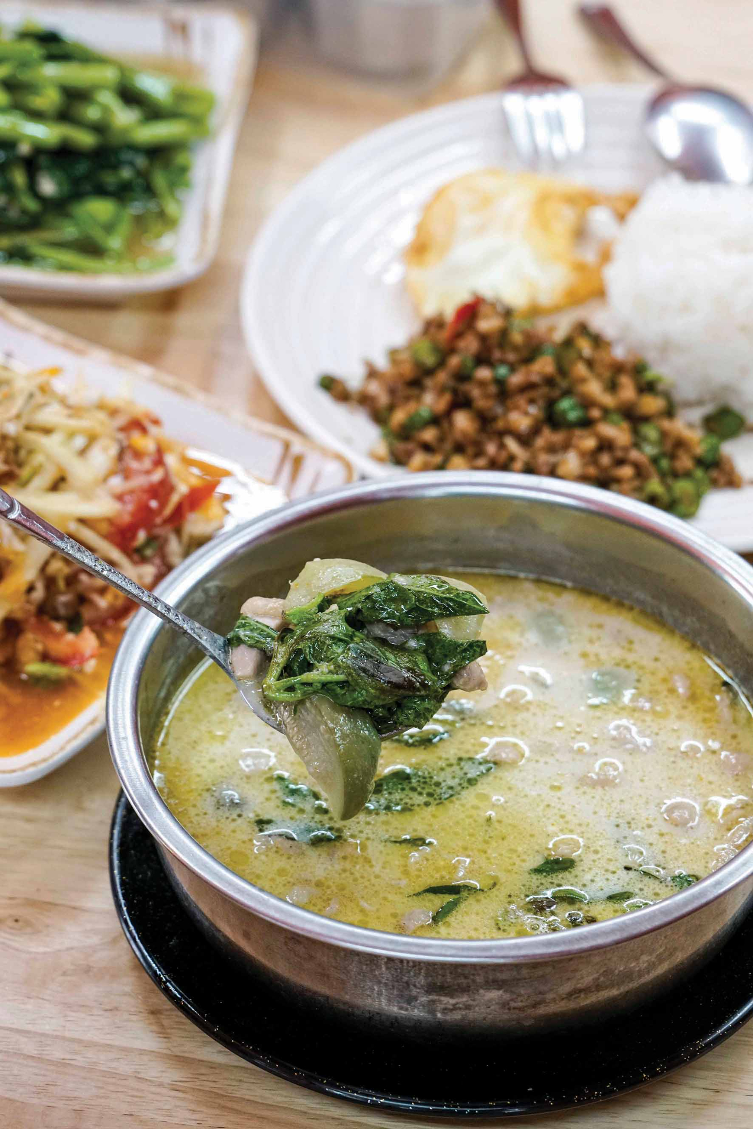 如果是泰國料理愛好者,那就不能錯過位於三樓的「K. JOY喬伊小姐泰式料理」,鮮橘色的牆面為其招牌,攤開菜單,各種經典泰國美味都能在這裡吃到,店家還讓客人自由選擇不同的辣度,不僅道地,也貼心台灣人不嗜重酸重辣的味蕾。泰式料理使用大量蔬果、香料等熱帶植物,最具代表性的就是台灣人也很熟悉的「打拋」系列,打拋其實就是一種香料,名字為「聖羅勒」,過去台灣未引進聖羅勒,因此多用九層塔來取代,除了拌炒豬肉,用來炒牛肉、雞肉、海鮮、皮蛋等都十分對味。