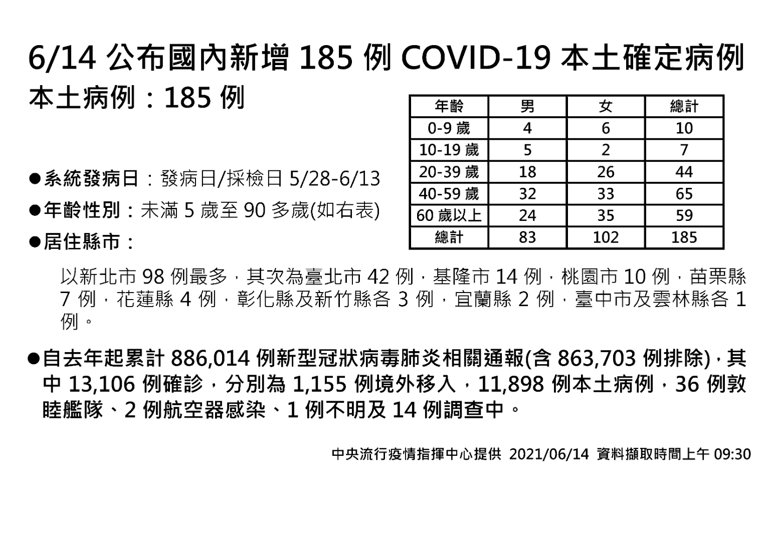 指揮中心指揮官陳時中表示,今日新增之185例本土病例,為83例男性、102例女性,年齡介於未滿5歲至90多歲,發病日介於今年5月28日至6月13日。個案分佈以新北市98例最多,其次為臺北市42例,基隆市14例,桃園市10例,苗栗縣7例,花蓮縣4例,彰化縣及新竹縣各3例,宜蘭縣2例,臺中市及雲林縣各1例。其中雙北地區以外縣市45例中,37例為已知感染源、5例關聯不明、3例調查中;相關疫情調查持續進行中。