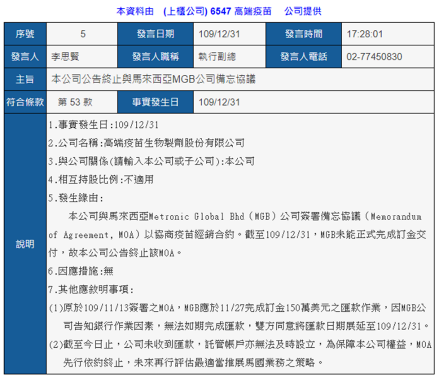 在12月31日收盤後,高端於發布重訊公告,因馬來西亞MGB公司未能完成訂金交付,高端疫苗終止與馬來西亞MGB公司備忘協議,馬來西亞交易破局。在2021年元旦假期過後的第一個交易日,高端疫苗股價持續跌至96.7元。