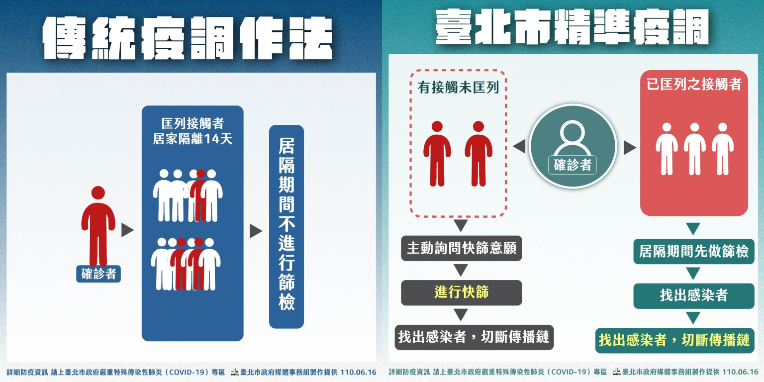 北市「清零計畫」採取「精準疫調」策略,即一人確診後,衛生單位會主動對其匡列者進行快篩,而非等到他們發病後才去處理,希望能藉此盡早阻斷感染源。